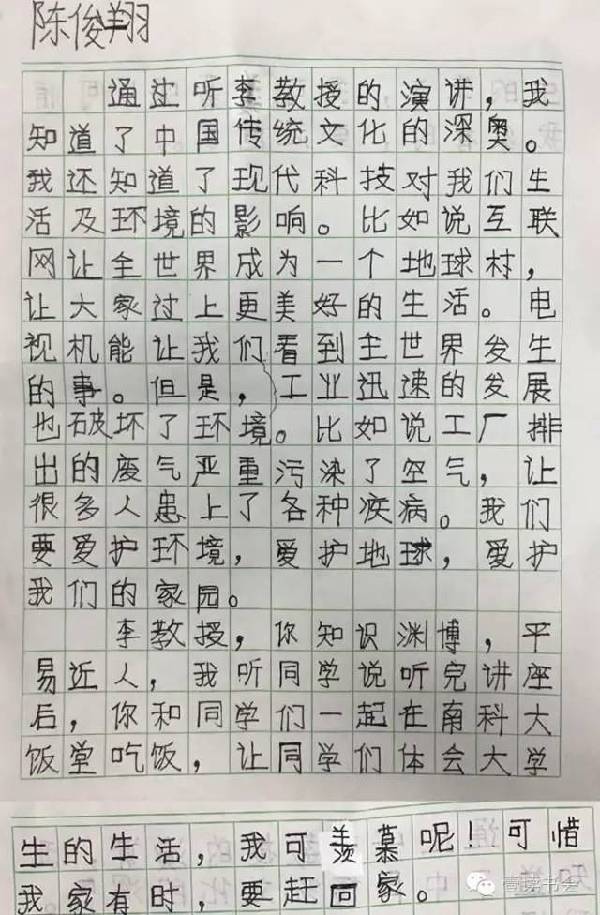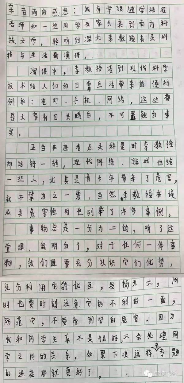 近日,多位小朋友特地就這次講座表達感想。他們紛紛盛贊講座深刻,令其受益匪淺,“深受感動”。他們紛紛在感想里提到李教授平易近人,講課精彩,更在聽完李教授的課后開始反思現(xiàn)代科技與當(dāng)代生活,提升自身思想和文化水平。