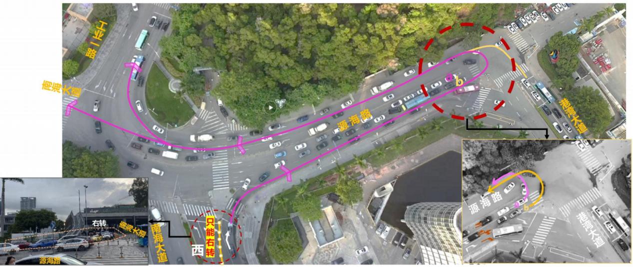 南山區(qū)南海大道時(shí)間廣場路段是通往蛇口、前海的重要道路,早晚高峰期車流量較大。修地鐵時(shí)在南海大道做了“布袋口臨時(shí)設(shè)施”,南海大道現(xiàn)已經(jīng)恢復(fù)通車,但因臨時(shí)設(shè)施還未及時(shí)拆掉,路口紅綠燈沒有啟用。加之車道收窄,原本可以快速左轉(zhuǎn)北行的車流被擠成一條右轉(zhuǎn)車道,再擠到老碼頭掉頭,四車道變一車道,導(dǎo)致高峰期多數(shù)車輛爭搶道,既不安全還加劇了擁堵。