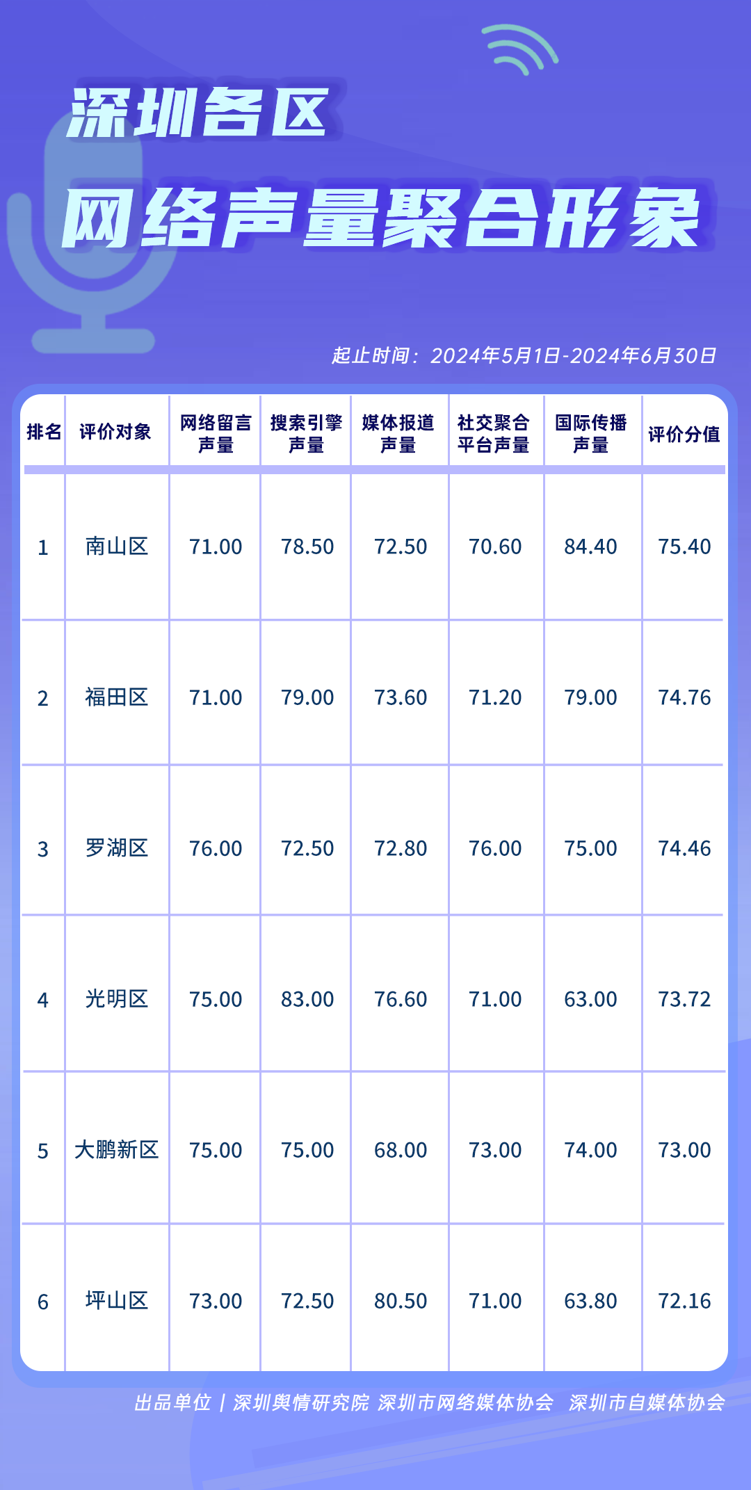5-6月,進入《深圳各區(qū)網(wǎng)絡(luò)聲量聚合形象榜》前三名的是南山區(qū)、福田區(qū)、羅湖區(qū)。其中,南山區(qū)在多區(qū)中脫穎而出,評價分值為75.40分,搜索引擎聲量、國際傳播聲量兩個指標的評價分值較高,反映出境內(nèi)外網(wǎng)民對南山區(qū)的較高關(guān)注度。福田區(qū)、羅湖區(qū)緊跟其后,位于第二、第三名,得分均在74分以上,彰顯出兩區(qū)在區(qū)域形象塑造方面優(yōu)秀的綜合實力。另外,位于第四至第六名的是光明區(qū)、大鵬新區(qū)、坪山區(qū),同樣贏得了公眾的廣泛認可,若能夠持續(xù)加力,保持進取態(tài)勢,未來必將展現(xiàn)更加卓越的風采。