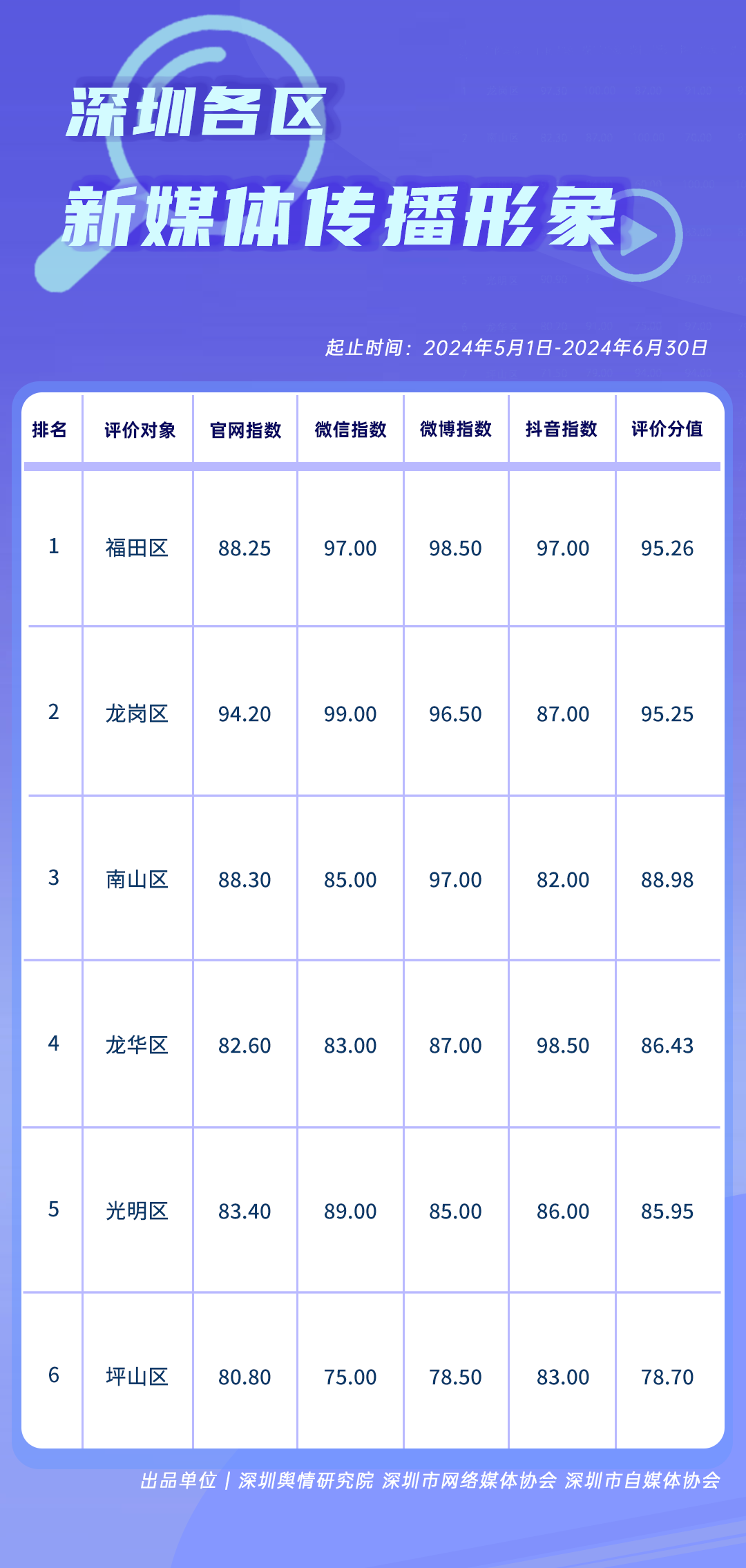 5-6月,在《深圳各區(qū)新媒體傳播形象榜》中,福田區(qū)、龍崗區(qū)、南山區(qū)、龍華區(qū)、光明區(qū)、坪山區(qū)均展現(xiàn)了出色的表現(xiàn),成功躋身榜單前六強。其中福田區(qū)、龍崗區(qū)超過95分的高分表現(xiàn)尤為搶眼,反映出兩區(qū)在新媒體傳播上的深度投入和創(chuàng)新實踐。南山區(qū)則以88.98分的成績,榮獲榜單第三名,顯示出其在提升新媒體傳播能力方面的不懈努力。龍華區(qū)、光明區(qū)和坪山區(qū)緊隨其后,分別位列第四至第六名,表明這些區(qū)域同樣在新媒體傳播領(lǐng)域不斷探索和深化工作,尋求創(chuàng)新的方式來提升自身的新媒體形象。整體來看,上榜區(qū)域的新媒體傳播工作不僅提升了信息傳播效率,也為塑造深圳各區(qū)的正面形象做出了積極貢獻。