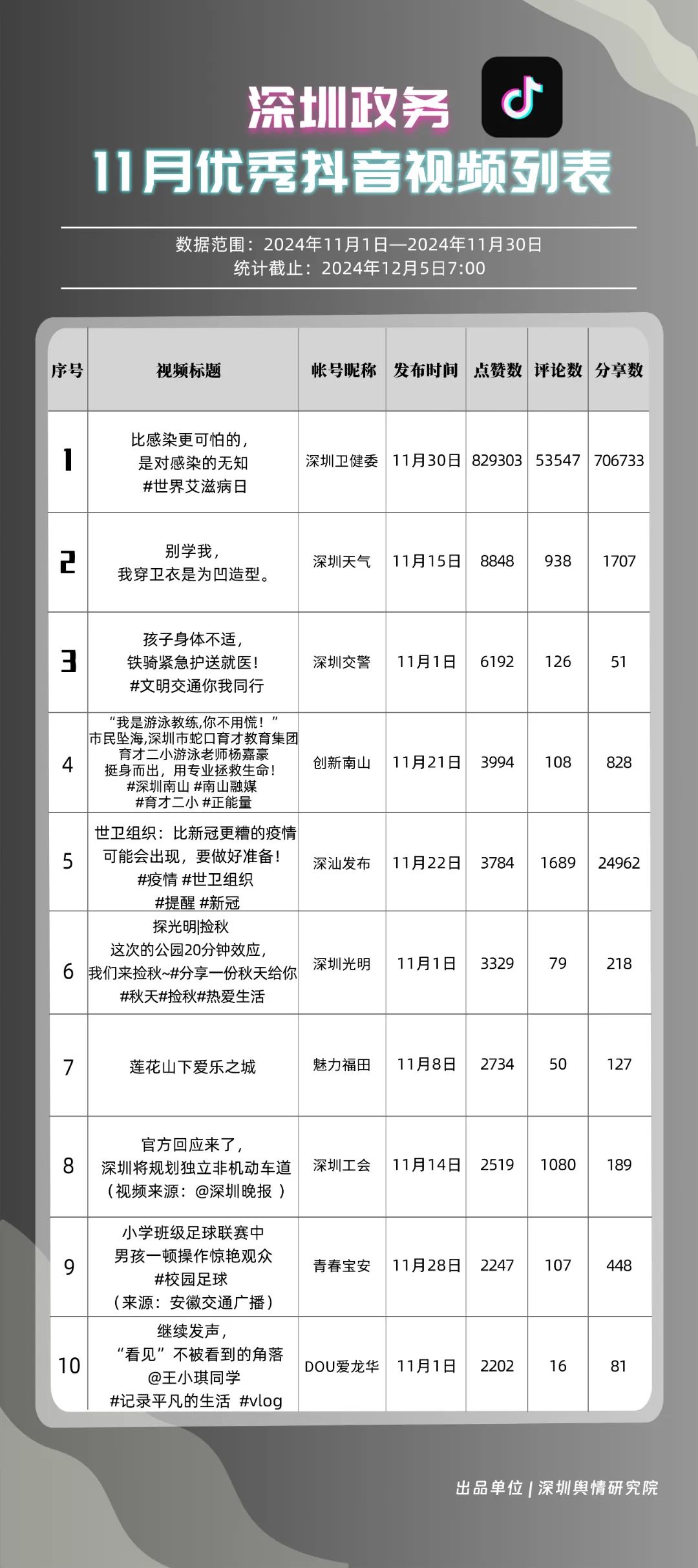 11月,“深圳衛(wèi)健委”“掌上龍崗”“深圳天氣”“深汕發(fā)布”“深圳工會”“深圳交警”“創(chuàng)新南山”“DOU愛龍華”“深圳光明”“中國前?!惫?0個政務(wù)抖音號獲得“深圳優(yōu)秀政務(wù)抖音號”稱號。“深圳衛(wèi)健委”憑借高質(zhì)量劇情內(nèi)容,巧妙融入健康知識,視頻累計(jì)收獲近百萬點(diǎn)贊。同時,“掌上龍崗”和“深圳天氣”也在視頻內(nèi)容創(chuàng)新上不斷探索,通過優(yōu)化宣傳策略和信息傳播方式,使得網(wǎng)民能夠在輕松愉快的氛圍中了解龍崗區(qū)的最新動態(tài)和深圳的天氣信息,展現(xiàn)了政務(wù)抖音號的獨(dú)特魅力與社會影響力。