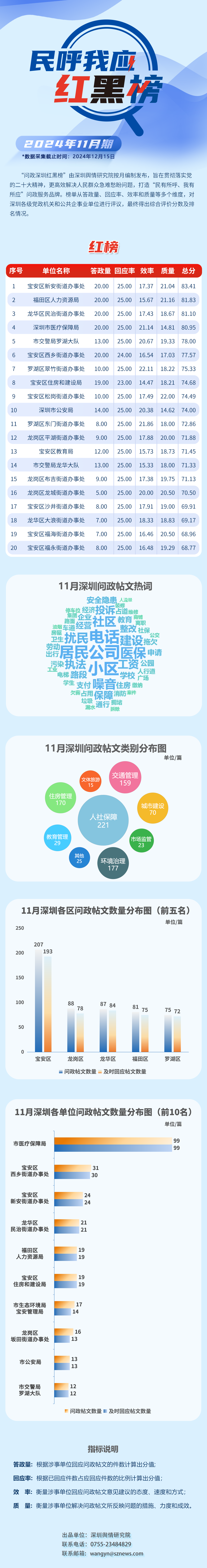 “深圳民呼我應(yīng)紅黑榜”由深圳輿情研究院按月編制發(fā)布,旨在貫徹落實黨的二十大精神,更高效解決人民群眾急難愁盼問題,打造“民有所呼、我有所應(yīng)”問政服務(wù)品牌。榜單從答政量、回應(yīng)率、效率和質(zhì)量等多個維度對深圳各級黨政機關(guān)和公共企事業(yè)單位進(jìn)行評議,最終得出綜合評價分?jǐn)?shù)及排名情況。