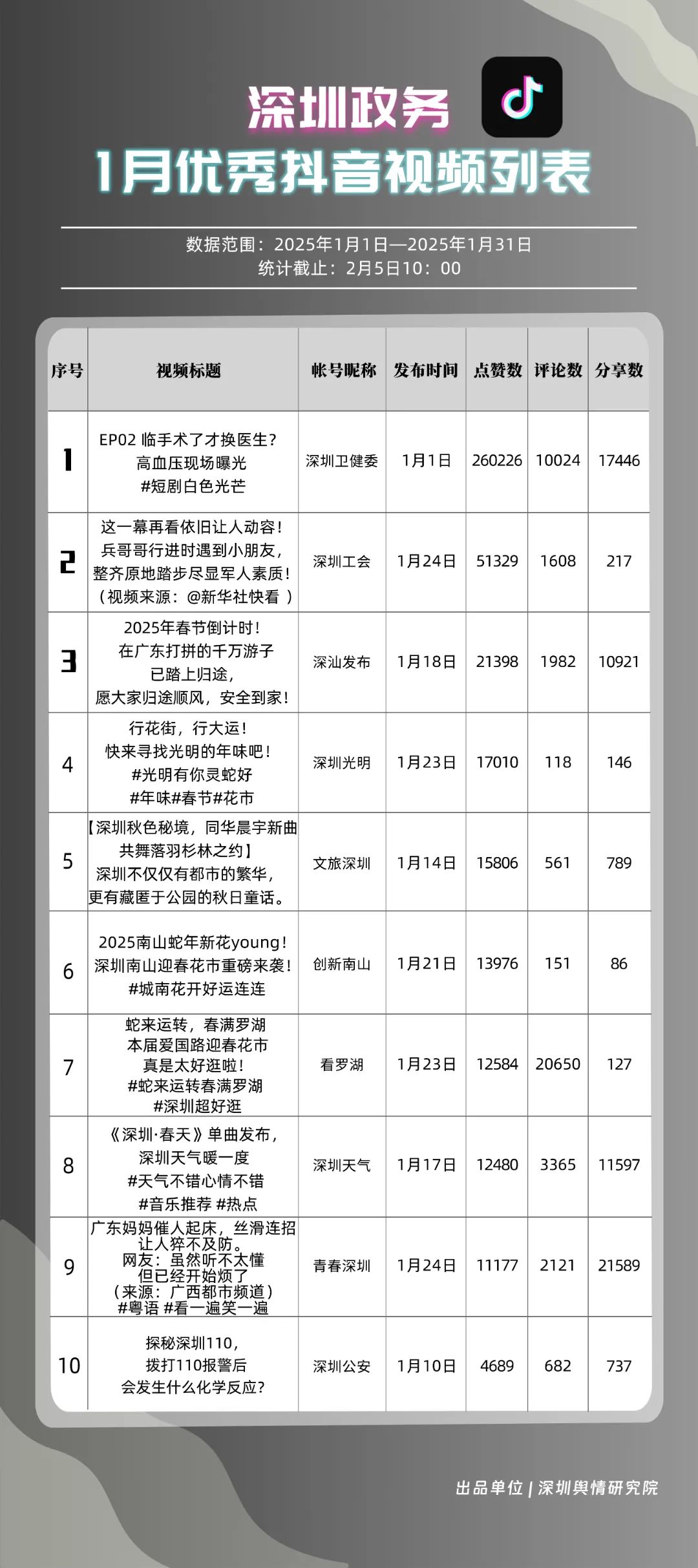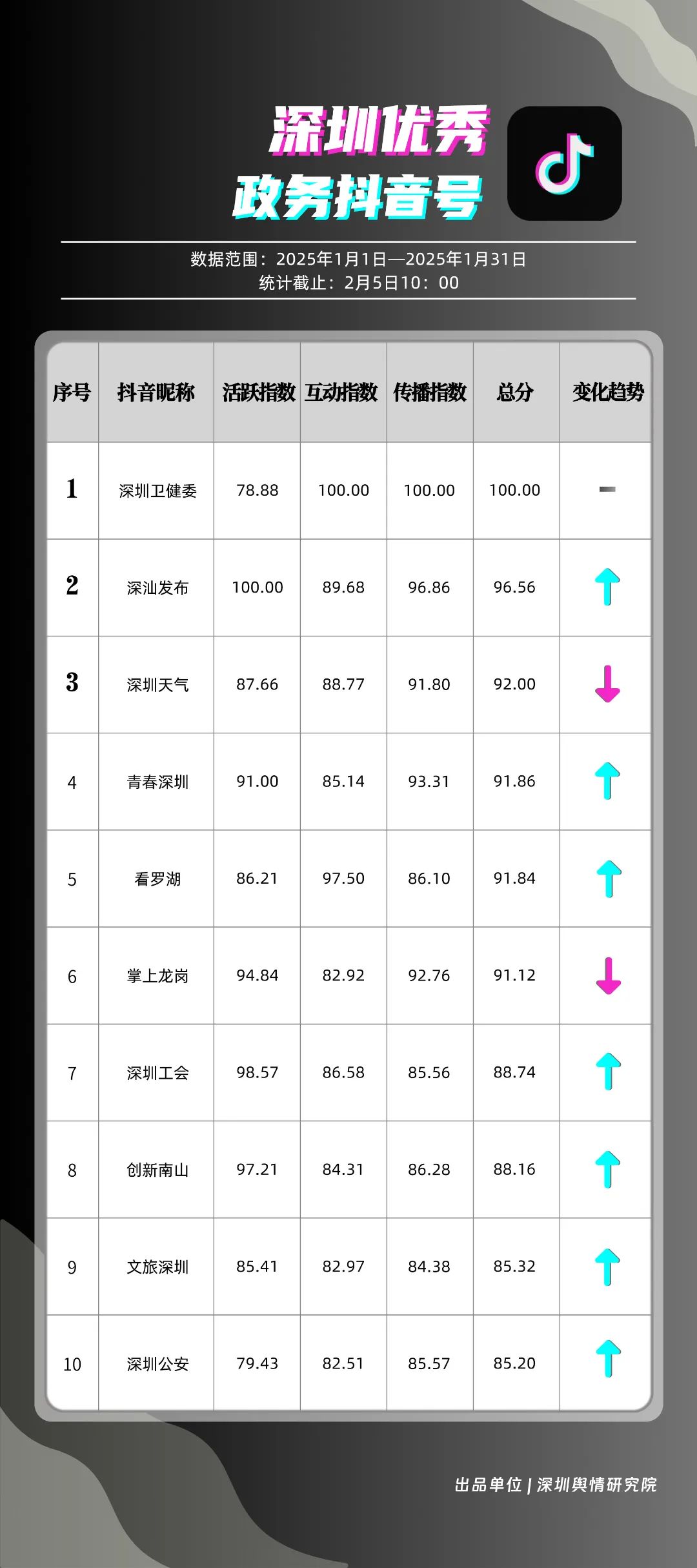 1月,“深圳衛(wèi)健委”“深汕發(fā)布”“深圳天氣”“青春深圳”“看羅湖”“掌上龍崗”“深圳工會(huì)”“創(chuàng)新南山”“文旅深圳”“深圳公安”共10個(gè)政務(wù)抖音號獲得“深圳優(yōu)秀政務(wù)抖音號”稱號?!吧钲谛l(wèi)健委”“深汕發(fā)布”“深圳天氣”成績優(yōu)異,綜合實(shí)力較強(qiáng),位于榜單前列?!扒啻荷钲凇薄翱戳_湖”等賬號排名有所提升,彰顯了這些賬號在拓寬受眾基礎(chǔ)、增強(qiáng)用戶黏性等方面所取得的積極成效。