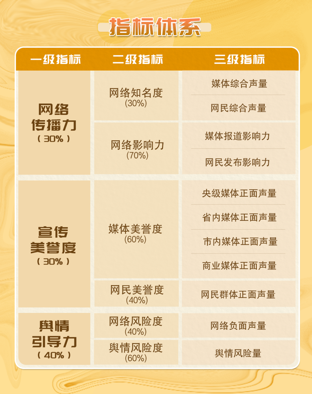 《深圳各街道網絡形象及影響力榜》具有科學、可信、量化的指標評價體系,能夠全面客觀地評估各街道的網絡綜合形象及影響力值。具體指標體系如下圖所示↓