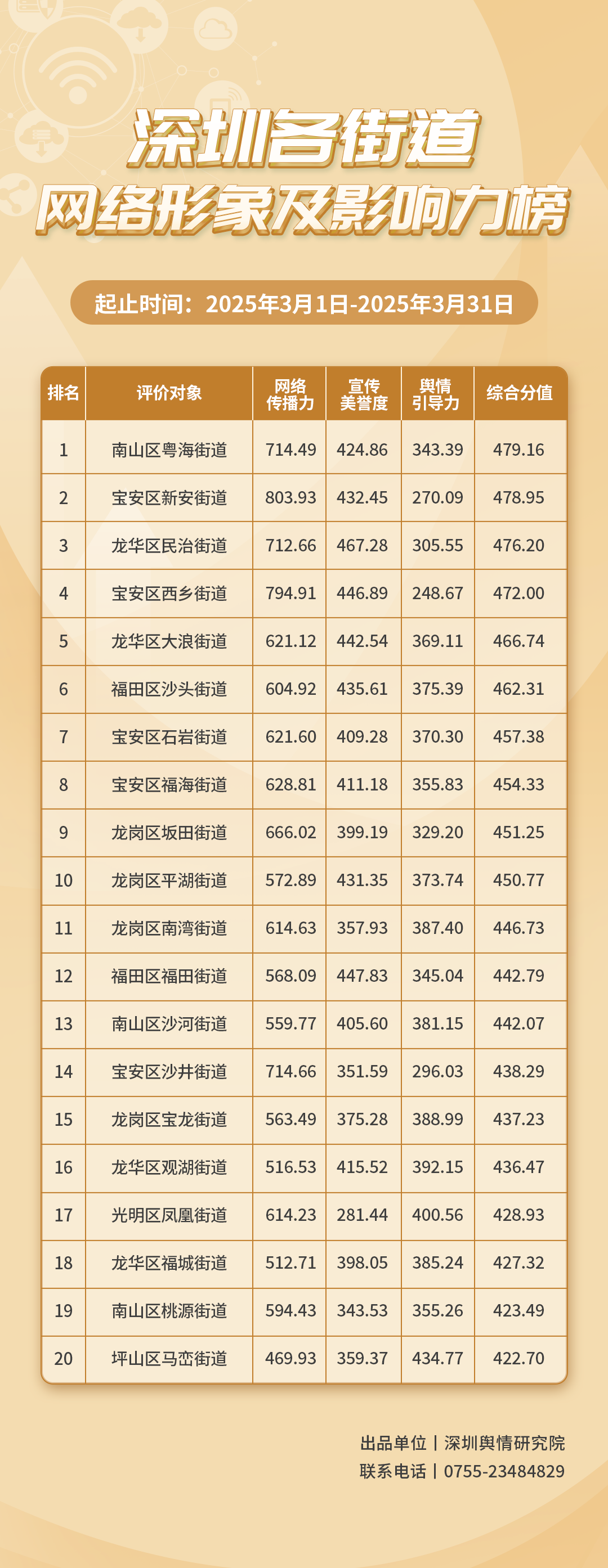 2025年3月,共有20個街道登上《深圳各街道網絡形象及影響力榜》,分別是:南山區(qū)粵海街道、寶安區(qū)新安街道、龍華區(qū)民治街道、寶安區(qū)西鄉(xiāng)街道、龍華區(qū)大浪街道、福田區(qū)沙頭街道、寶安區(qū)石巖街道、寶安區(qū)福海街道、龍崗區(qū)坂田街道、龍崗區(qū)平湖街道、龍崗區(qū)南灣街道、福田區(qū)福田街道、南山區(qū)沙河街道、寶安區(qū)沙井街道、龍崗區(qū)寶龍街道、龍華區(qū)觀湖街道、光明區(qū)鳳凰街道、龍華區(qū)福城街道、南山區(qū)桃源街道、坪山區(qū)馬巒街道。