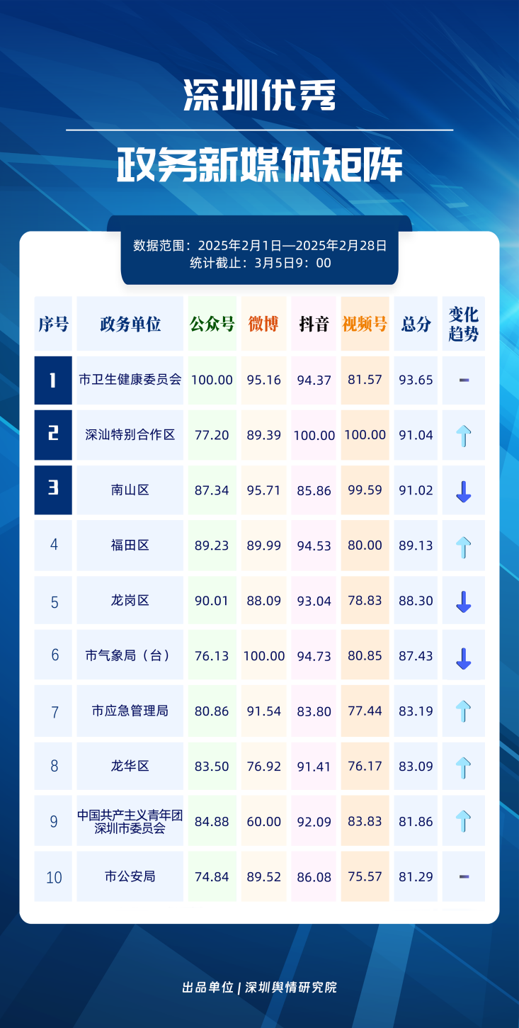 2月,市衛(wèi)生健康委、深汕特別合作區(qū)、南山區(qū)、福田區(qū)、龍崗區(qū)、市氣象局、市應(yīng)急管理局、龍華區(qū)、中國共產(chǎn)主義青年團深圳市委員會、市公安局榮登“深圳優(yōu)秀政務(wù)新媒體矩陣”榜單。2月,市衛(wèi)生健康委賬號運營成績亮眼,微信公眾號平臺閱讀量破10萬次的文章超60篇;深汕特別合作區(qū)新媒體矩陣緊抓網(wǎng)絡(luò)熱點,作品吸引力顯著;南山區(qū)新媒體矩陣則持續(xù)發(fā)力宣傳,其微博號、頭條號在對應(yīng)平臺榜單中居于前二位置。以上賬號在“深圳優(yōu)秀政務(wù)新媒體矩陣”榜單中榮獲前三名。此外,福田區(qū)新媒體矩陣深耕短視頻領(lǐng)域與今日頭條平臺,位于“深圳優(yōu)秀政務(wù)新媒體矩陣”第四名,彰顯出優(yōu)秀的內(nèi)容產(chǎn)出能力;龍崗區(qū)新媒體矩陣的抖音號分數(shù)超93分,反映其在視頻制作方面的良苦用心,不斷提升內(nèi)容傳播價值;市氣象局新媒體矩陣則在微博、抖音平臺持續(xù)創(chuàng)新氣象領(lǐng)域內(nèi)容,打造“趣味科普+民生服務(wù)”雙驅(qū)模式。