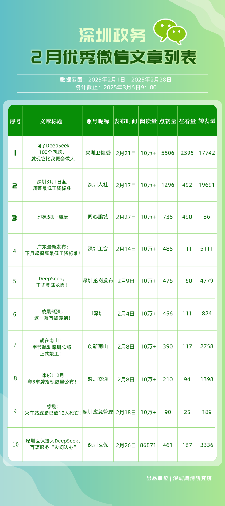 2025年2月期《深圳優(yōu)秀政務(wù)新媒體矩陣》發(fā)布,本期榜單框架有所優(yōu)化,公眾號、微博號、抖音號、視頻號得分在綜合計算時的權(quán)重調(diào)整為30%、20%、30%、20%。公眾號榜單中,根據(jù)閱讀量超10萬次的文章篇數(shù),在傳播指數(shù)額外加分,激勵優(yōu)質(zhì)內(nèi)容產(chǎn)出。接下來,讓我們一同揭曉,2月哪些矩陣成為政務(wù)信息傳播與服務(wù)創(chuàng)新標桿,為政務(wù)新媒體矩陣創(chuàng)新發(fā)展樹立高質(zhì)量發(fā)展范式。