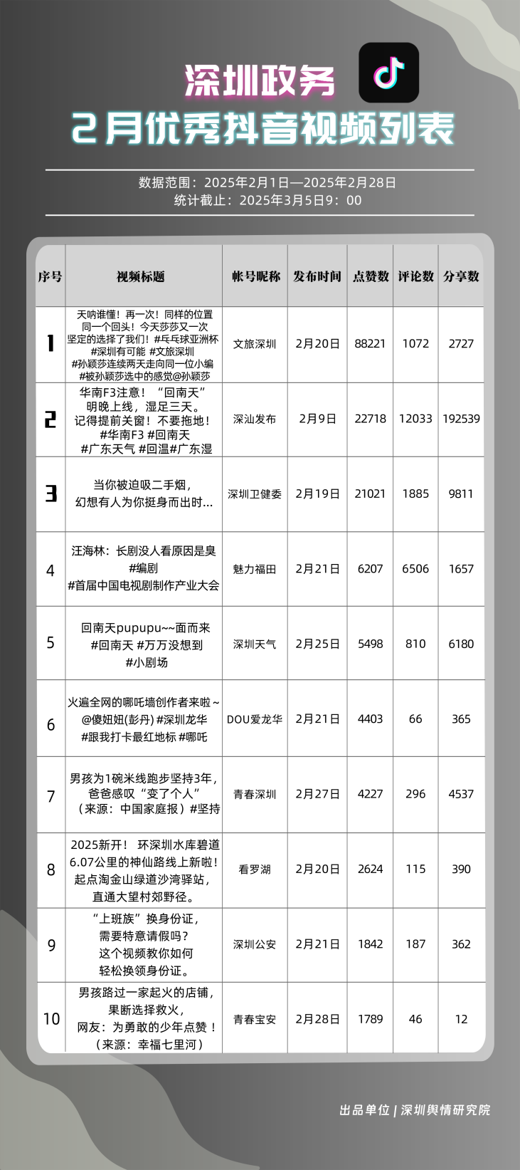 2月,“深汕發(fā)布”“深圳天氣”“魅力福田”“深圳衛(wèi)健委”“文旅深圳”“掌上龍崗”“青春深圳”“DOU愛龍華”“深圳工會”“深圳公安”共10個政務(wù)抖音號獲得“深圳優(yōu)秀政務(wù)抖音號”稱號?!吧钌前l(fā)布”位于榜單第一名,值得關(guān)注的是,該賬號2月作品總分享數(shù)超20萬次,其中有關(guān)“華南地區(qū)回南天”的視頻單條分享量達到19萬次以上,展現(xiàn)出強勁的傳播力。“深圳天氣”“魅力福田”“深圳衛(wèi)健委”三賬號堅持輸出優(yōu)質(zhì)內(nèi)容,得分均在94分以上,展現(xiàn)出深圳政務(wù)新媒體賬號在短視頻傳播領(lǐng)域的創(chuàng)新活力。