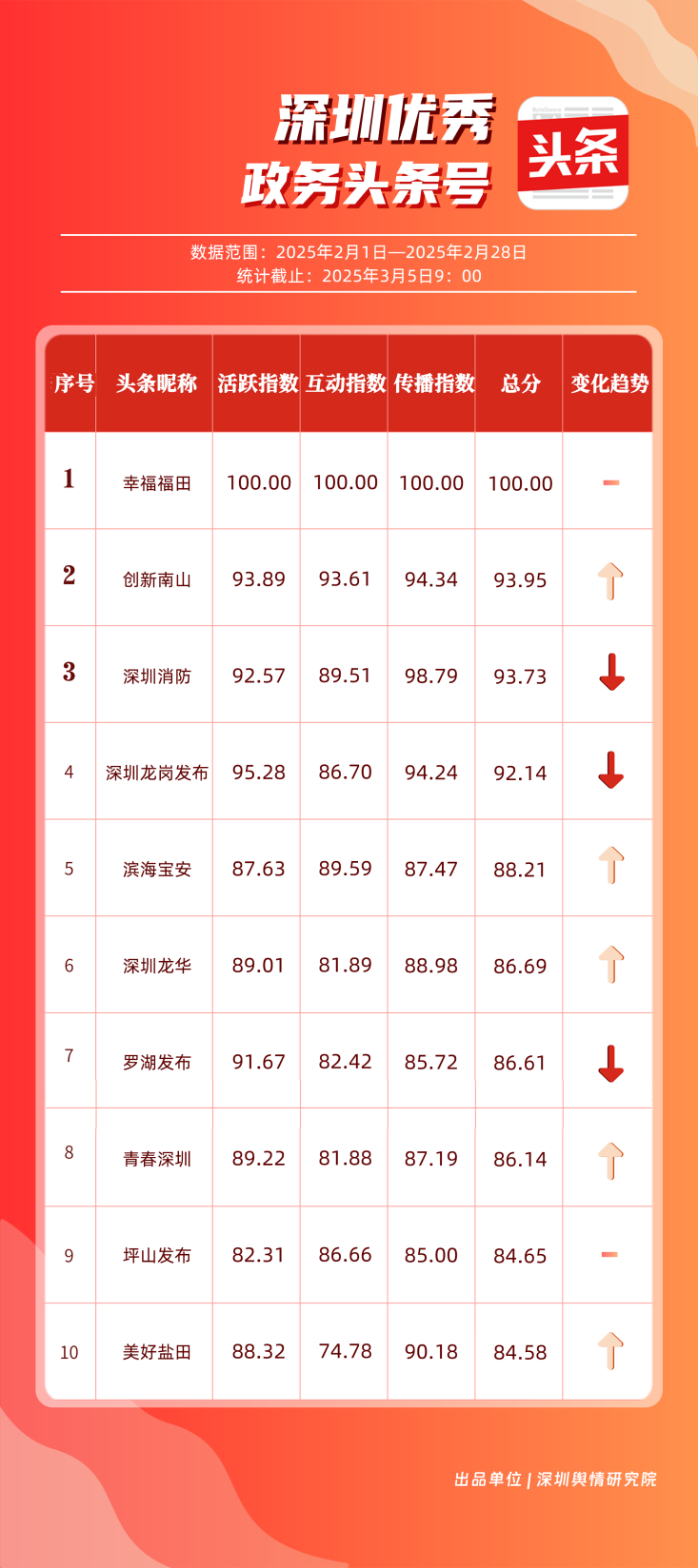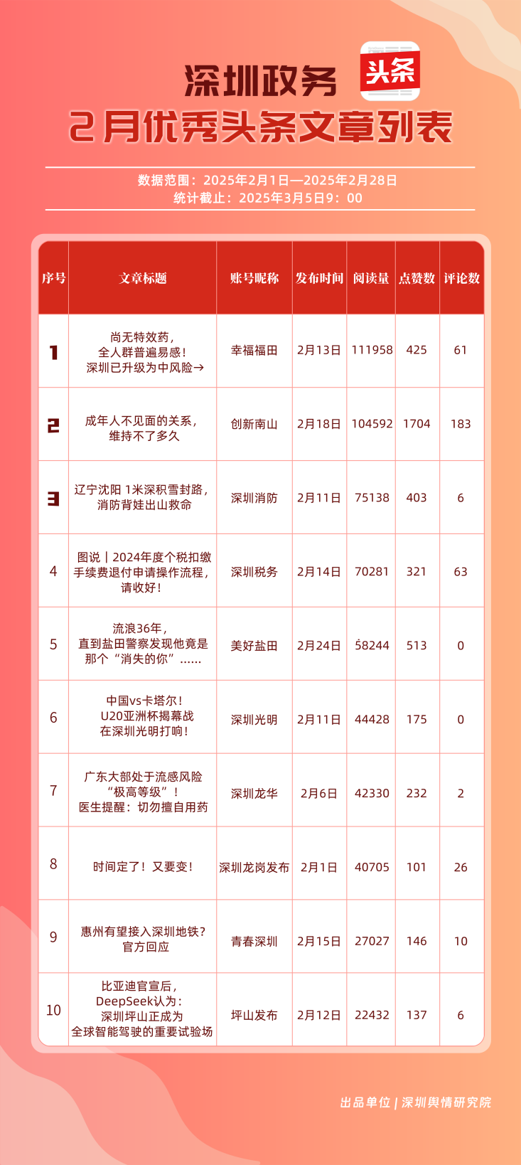 2月,“幸福福田”“創(chuàng)新南山”“深圳消防”“深圳龍崗發(fā)布”“濱海寶安”“深圳龍華”“羅湖發(fā)布”“青春深圳”“坪山發(fā)布”“美好鹽田”共10個政務(wù)頭條號入選“優(yōu)秀政務(wù)頭條號”榜單。“幸福福田”2月今日頭條作品總閱讀數(shù)超60萬,綜合實力較強,多次位居頭條平臺榜單第一?!皠?chuàng)新南山”“深圳消防”“深圳龍崗發(fā)布”總分均在90分以上,展現(xiàn)出深圳政務(wù)頭條號的持續(xù)影響力,為其他政務(wù)賬號提供了可借鑒的運營范例。