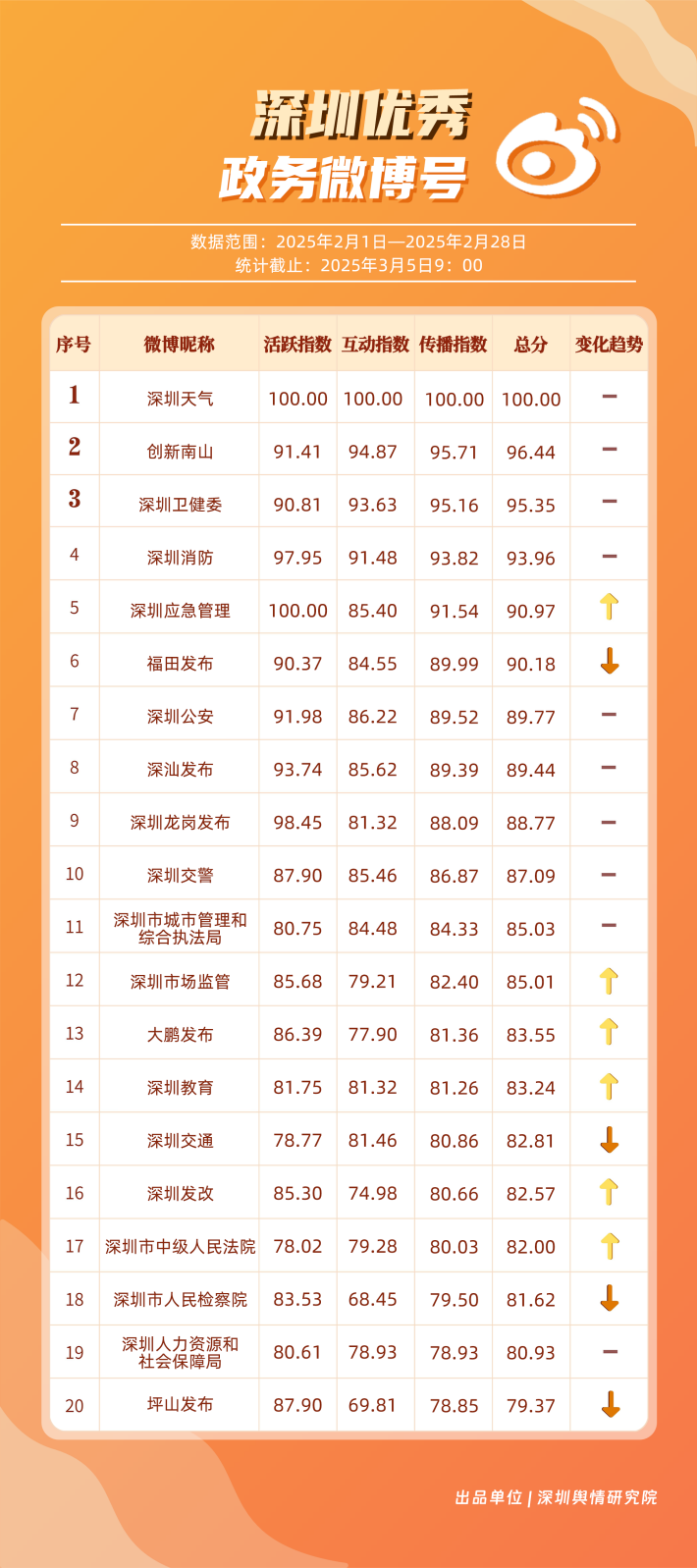 2月,“深圳天氣”“創(chuàng)新南山”“深圳衛(wèi)健委”“深圳消防”“深圳應(yīng)急管理”“福田發(fā)布”“深圳公安”“深汕發(fā)布”“深圳龍崗發(fā)布”“深圳交警”等20個賬號入選“優(yōu)秀政務(wù)微博號”。綜合看來,本月榜單前10名較上期變動不大,反映出靠前賬號運營發(fā)揮較穩(wěn)定。其中,“深圳天氣”在榜單中獲得第一名,該賬號與網(wǎng)民互動積極,2月作品總點贊數(shù)超8萬次;“創(chuàng)新南山”“深圳衛(wèi)健委”“深圳消防”“深圳應(yīng)急管理”也各有所長,排名靠前,展現(xiàn)出深圳政務(wù)微博在形象塑造、民生服務(wù)、應(yīng)急科普等領(lǐng)域的持續(xù)影響力。