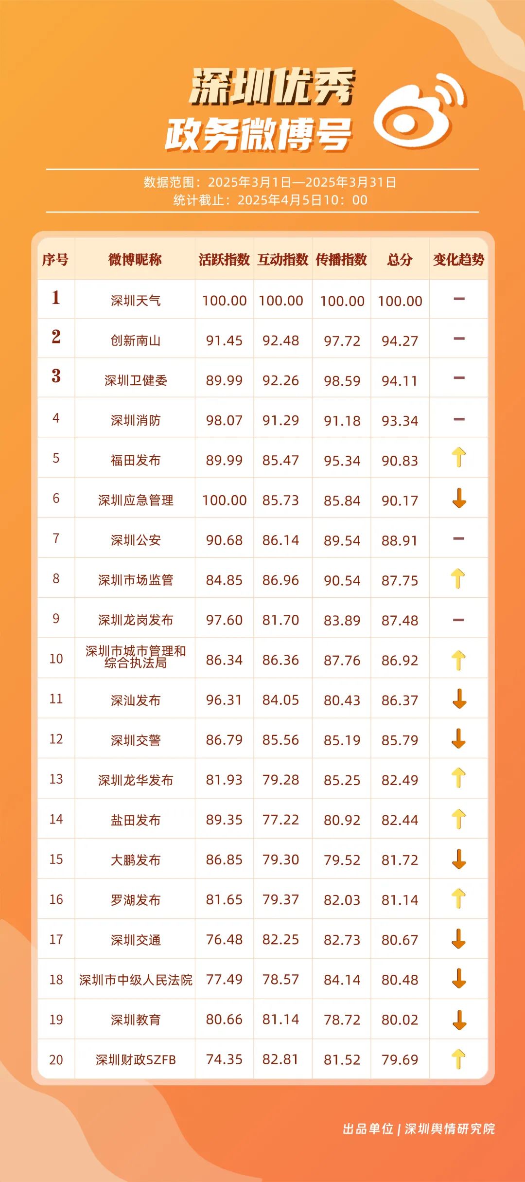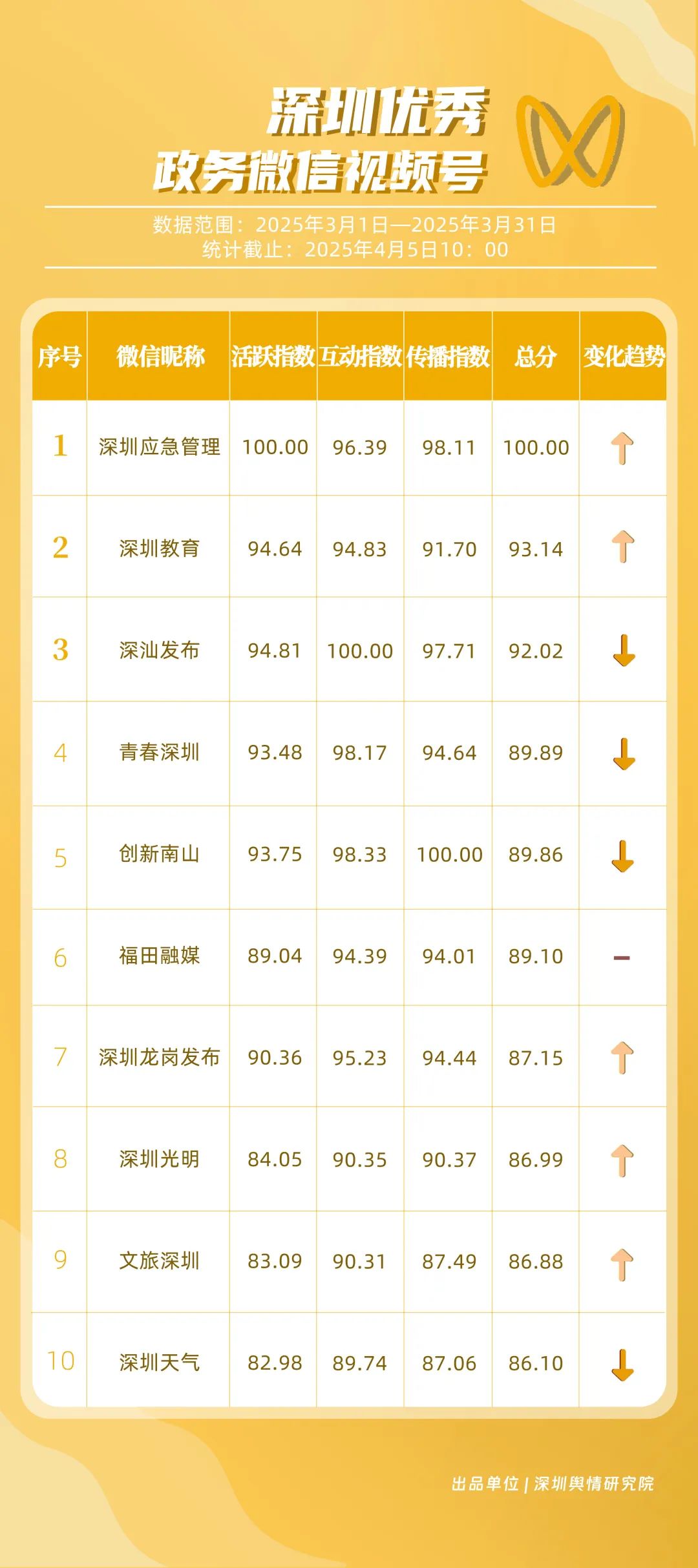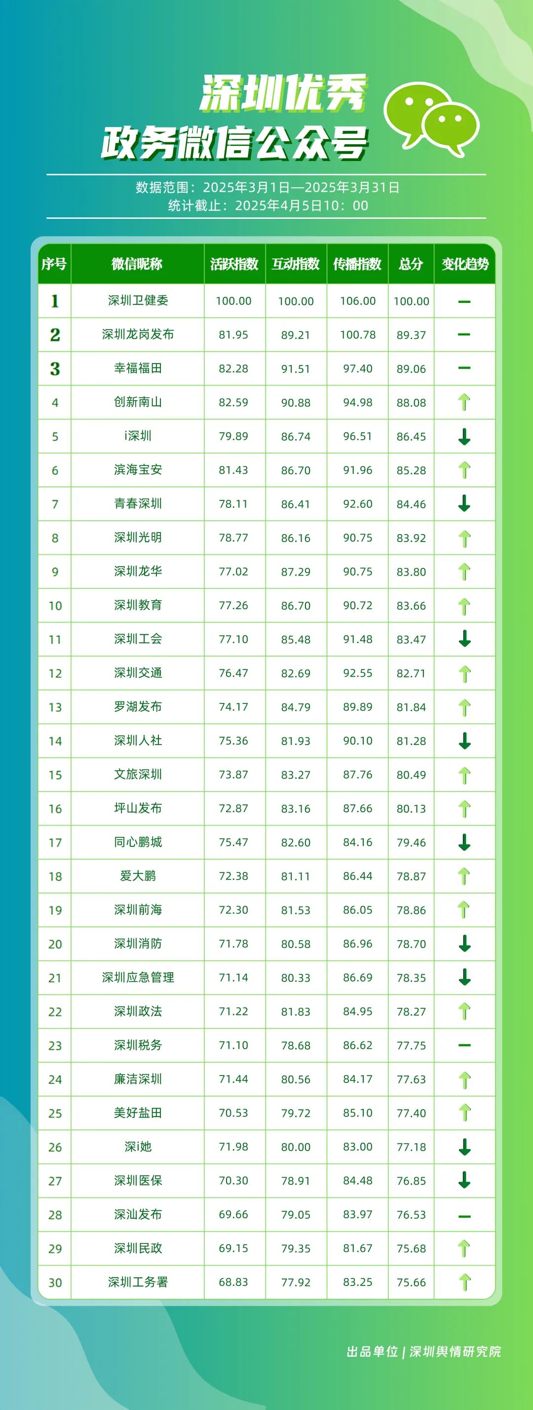 3月,市衛(wèi)生健康委、龍崗區(qū)、市氣象局、深汕特別合作區(qū)、南山區(qū)、福田區(qū)、市應(yīng)急管理局、龍華區(qū)、寶安區(qū)、光明區(qū)榮登“深圳優(yōu)秀政務(wù)新媒體矩陣”榜單。3月,市衛(wèi)生健康委新媒體矩陣持續(xù)關(guān)注市民身心健康,發(fā)布健康科普內(nèi)容,穩(wěn)居榜單第一位;龍崗區(qū)新媒體矩陣在抖音、微信視頻號平臺發(fā)力宣傳,躍居榜單第二位;市氣象局新媒體矩陣在微博平臺連續(xù)多期獲得滿分,持續(xù)以氣象預警與生活指南結(jié)合的內(nèi)容模式,為市民帶來便利信息。以上賬號在“深圳優(yōu)秀政務(wù)新媒體矩陣”榜單中榮獲前三名。此外,深汕特別合作區(qū)新媒體矩陣積極發(fā)布網(wǎng)絡(luò)熱點內(nèi)容,收獲較多網(wǎng)民關(guān)注分享;南山區(qū)新媒體矩陣多平臺實力強勁,以88.37分居于榜單第五位。值得關(guān)注的是,寶安區(qū)新媒體矩陣時隔多期躋身榜單前十名,多平臺均衡發(fā)展成效初顯。