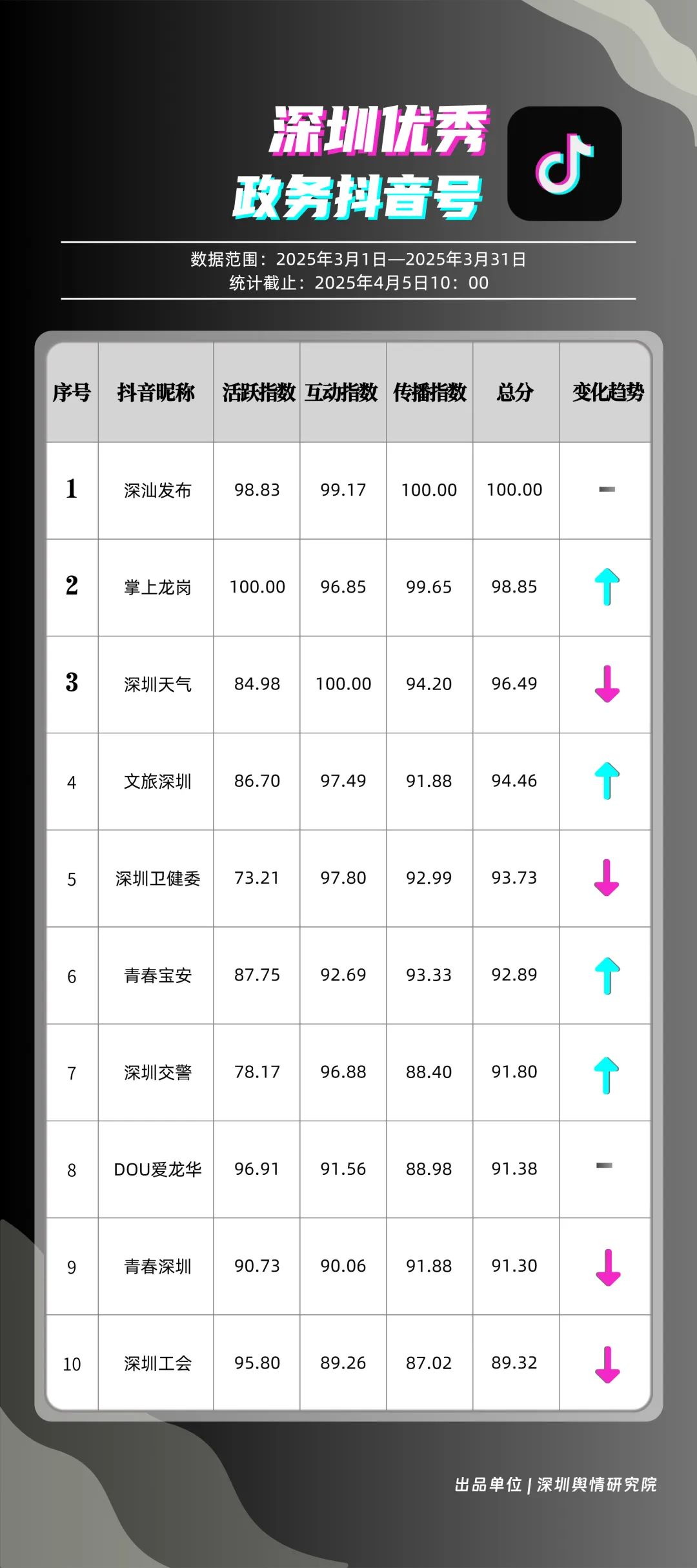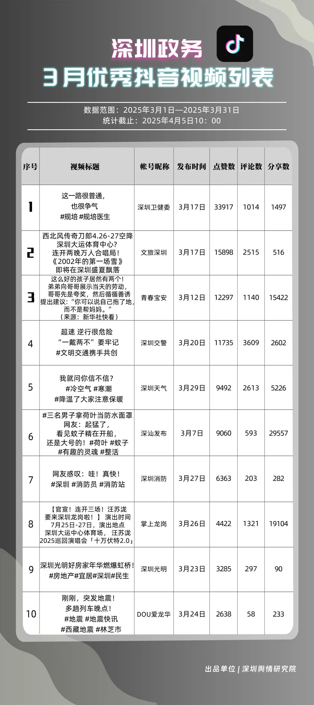 3月,“深汕發(fā)布”“掌上龍崗”“深圳天氣”“文旅深圳”“深圳衛(wèi)健委”“青春寶安”“深圳交警”“DOU愛龍華”“青春深圳”“深圳工會”共10個政務(wù)抖音號獲得“深圳優(yōu)秀政務(wù)抖音號”稱號。其中,“深汕發(fā)布”位于榜單第一名,3月共收獲5萬余次點贊、8萬余次轉(zhuǎn)發(fā),反映出賬號作品的較高吸引力;“深圳龍崗”以98.85分位于榜單第二名,與榜首分差微小,整體實力不俗。緊隨其后的分別是“深圳天氣”“文旅深圳”“深圳衛(wèi)健委”,三賬號產(chǎn)出內(nèi)容優(yōu)質(zhì),也獲得較高評分。相關(guān)上榜單位展現(xiàn)了深圳政務(wù)新媒體賬號在短視頻傳播領(lǐng)域的創(chuàng)新探索力與傳播實效性。