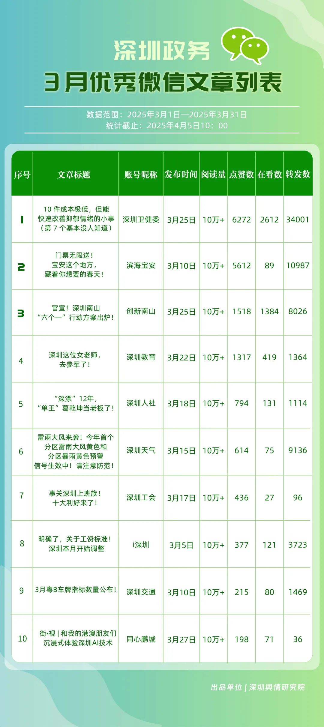 3月,包括“深圳衛(wèi)健委”“深圳龍崗發(fā)布”“幸福福田”“創(chuàng)新南山”“i深圳”“濱海寶安”“青春深圳”“深圳光明”“深圳龍華”“深圳教育”等在內(nèi)的30個賬號入選“深圳優(yōu)秀政務(wù)微信公眾號”。其中,“深圳衛(wèi)健委”超70篇文章閱讀量達10萬次以上,穩(wěn)居榜單首位;“深圳龍崗發(fā)布”也取得較好傳播效果,在3月產(chǎn)出10余篇閱讀量超10萬次的熱門文章,位于榜單第二位;“幸福福田”也積極發(fā)布高質(zhì)量內(nèi)容,穩(wěn)住榜單第三位置;緊隨其后的是“創(chuàng)新南山”“i深圳”“濱海寶安”,總分均在85分以上。這充分展現(xiàn)了深圳新媒體傳播生態(tài)體系中,各主體的傳播優(yōu)勢與影響力版圖正逐漸凸顯。