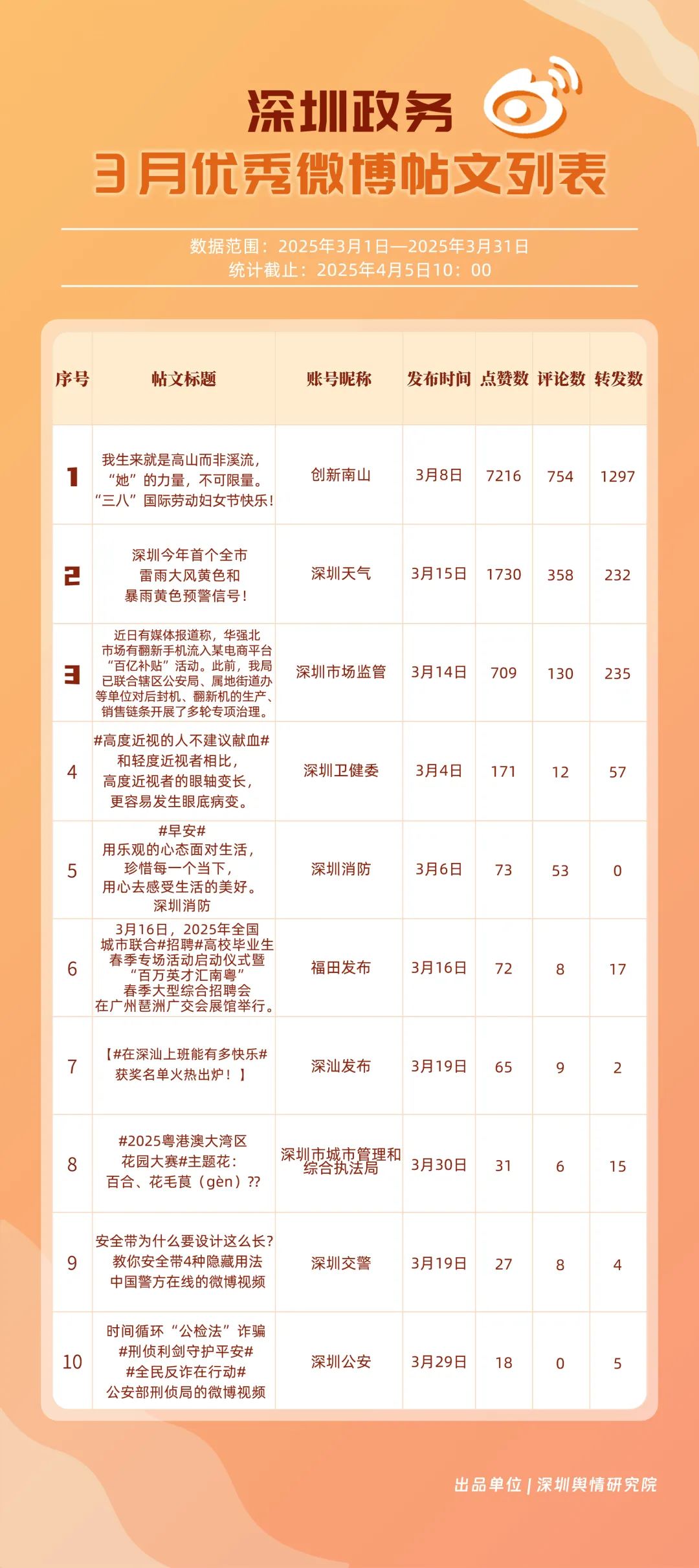3月,“深圳天氣”“創(chuàng)新南山”“深圳衛(wèi)健委”“深圳消防”“福田發(fā)布”“深圳應(yīng)急管理”“深圳公安”“深圳市場監(jiān)管”“深圳龍崗發(fā)布”“深圳市城市管理和綜合執(zhí)法局”等20個賬號入選“優(yōu)秀政務(wù)微博號”。值得一提的是,“深圳天氣”賬號在3月共獲得點贊超11萬,相較其他賬號具備顯著優(yōu)勢。“創(chuàng)新南山”“深圳衛(wèi)健委”“深圳消防”也位列前茅,分差微小,競爭激烈。從領(lǐng)域分布來看,上榜賬號不僅包括區(qū)級賬號,還涵蓋民生服務(wù)、應(yīng)急科普、城市治理等單位賬號,體現(xiàn)了深圳政務(wù)新媒體在多領(lǐng)域的強大影響力。