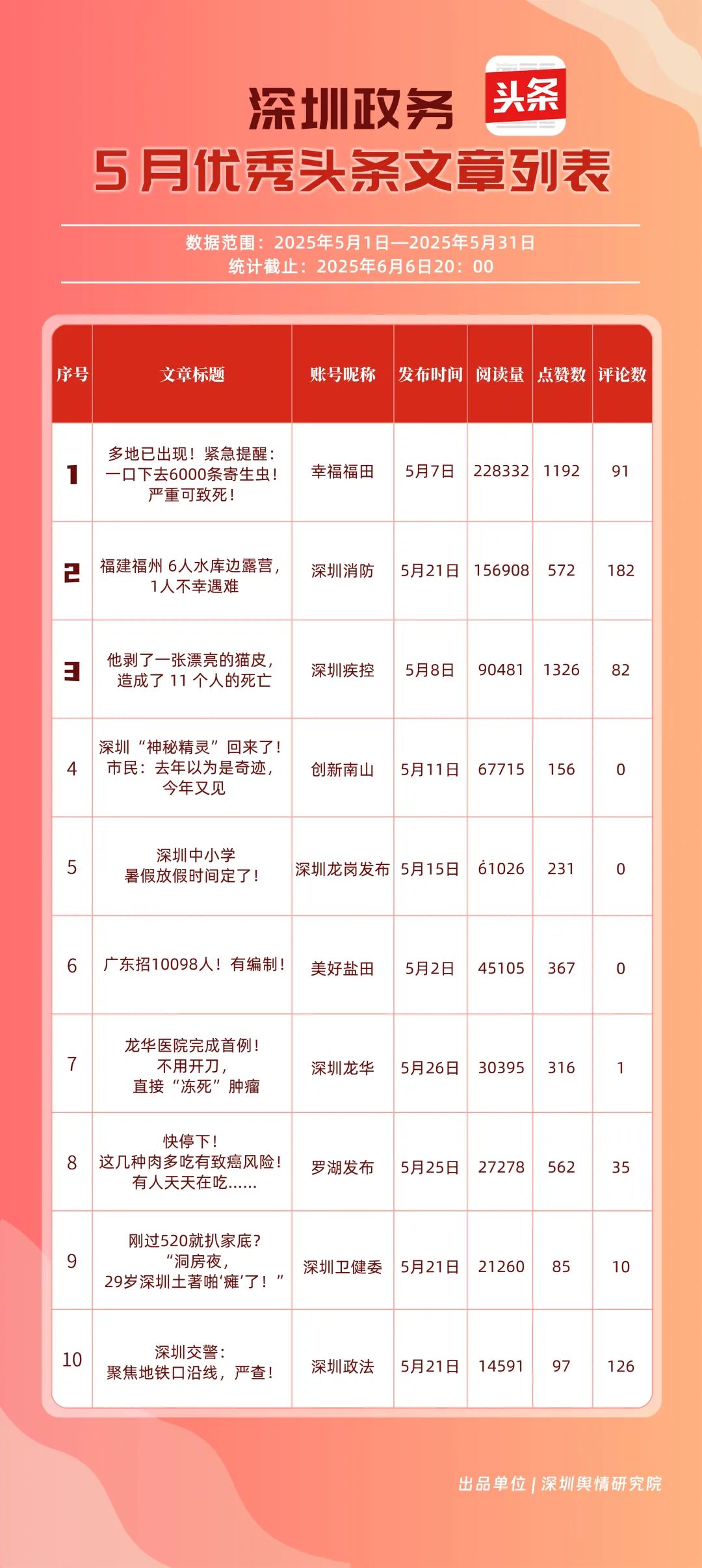 5月,“幸福福田”“深圳消防”“創(chuàng)新南山”“深圳疾控”“羅湖發(fā)布”“深圳龍崗發(fā)布”“坪山發(fā)布”“青春深圳”“深圳龍華”“深圳人社”共10個(gè)政務(wù)頭條號(hào)入選“優(yōu)秀政務(wù)頭條號(hào)”榜單。在榜單前三名中,“幸福福田”“創(chuàng)新南山”以穩(wěn)定且高質(zhì)量的內(nèi)容輸出,持續(xù)領(lǐng)跑,排名較上個(gè)月未發(fā)生變動(dòng)。位居榜單第二的“深圳消防”同樣表現(xiàn)亮眼,排名較上個(gè)月提升2個(gè)名次,充分展現(xiàn)了其在消防安全宣傳領(lǐng)域的持續(xù)深耕和創(chuàng)新突破。上榜政務(wù)頭條號(hào)各展所長(zhǎng),以優(yōu)質(zhì)內(nèi)容為核心,充分發(fā)揮平臺(tái)傳播優(yōu)勢(shì),為政務(wù)信息的高效觸達(dá)與廣泛傳播樹(shù)立了標(biāo)桿。