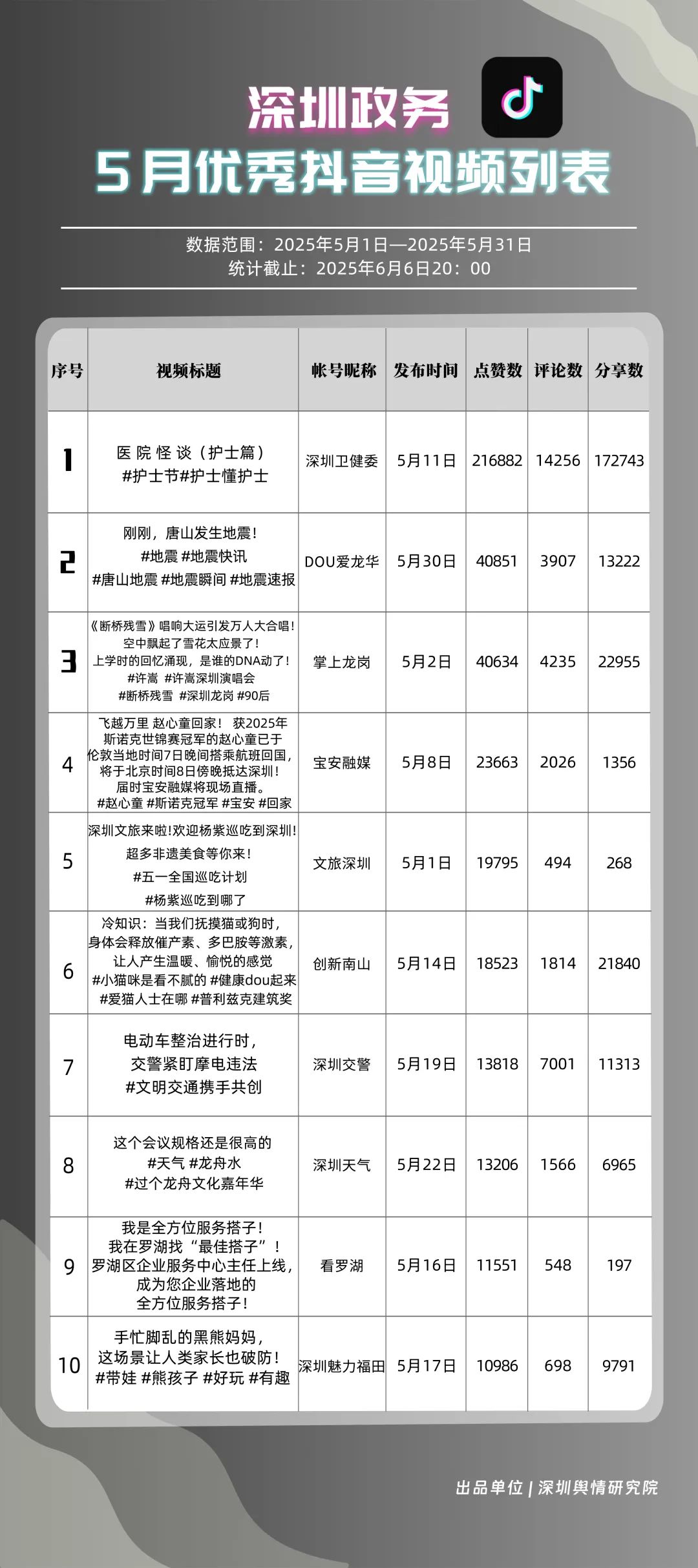 5月,“深圳衛(wèi)健委”“DOU愛(ài)龍華”“掌上龍崗”“深圳天氣”“創(chuàng)新南山”“深圳交警”“深圳魅力福田”“寶安融媒”“深汕發(fā)布”“文旅深圳”共10個(gè)政務(wù)抖音號(hào)獲得“優(yōu)秀政務(wù)抖音號(hào)”稱號(hào)。5月,“深圳衛(wèi)健委”憑借3條極具創(chuàng)意的視頻內(nèi)容持續(xù)收獲網(wǎng)民關(guān)注,穩(wěn)居榜首之位,成為政務(wù)抖音號(hào)領(lǐng)域的標(biāo)桿?!癉OU愛(ài)龍華”“掌上龍崗”較上個(gè)月排名大幅度上升,以96.77分和95.81分位居榜單第2、3名,彰顯出積極探索創(chuàng)新傳播路徑、開(kāi)拓政務(wù)短視頻發(fā)展新可能的決心。以上優(yōu)秀政務(wù)抖音號(hào)通過(guò)多樣化的短視頻形式傳遞政務(wù)資訊,為深圳政務(wù)新媒體在短視頻領(lǐng)域的蓬勃發(fā)展注入強(qiáng)勁動(dòng)能,成為政務(wù)信息傳播的新標(biāo)桿。