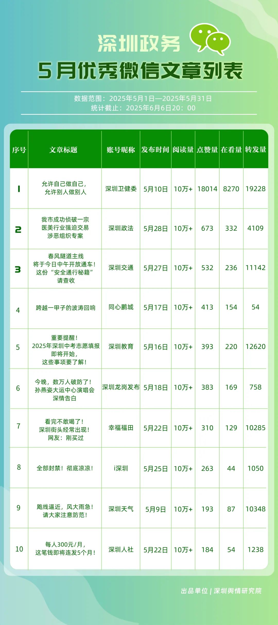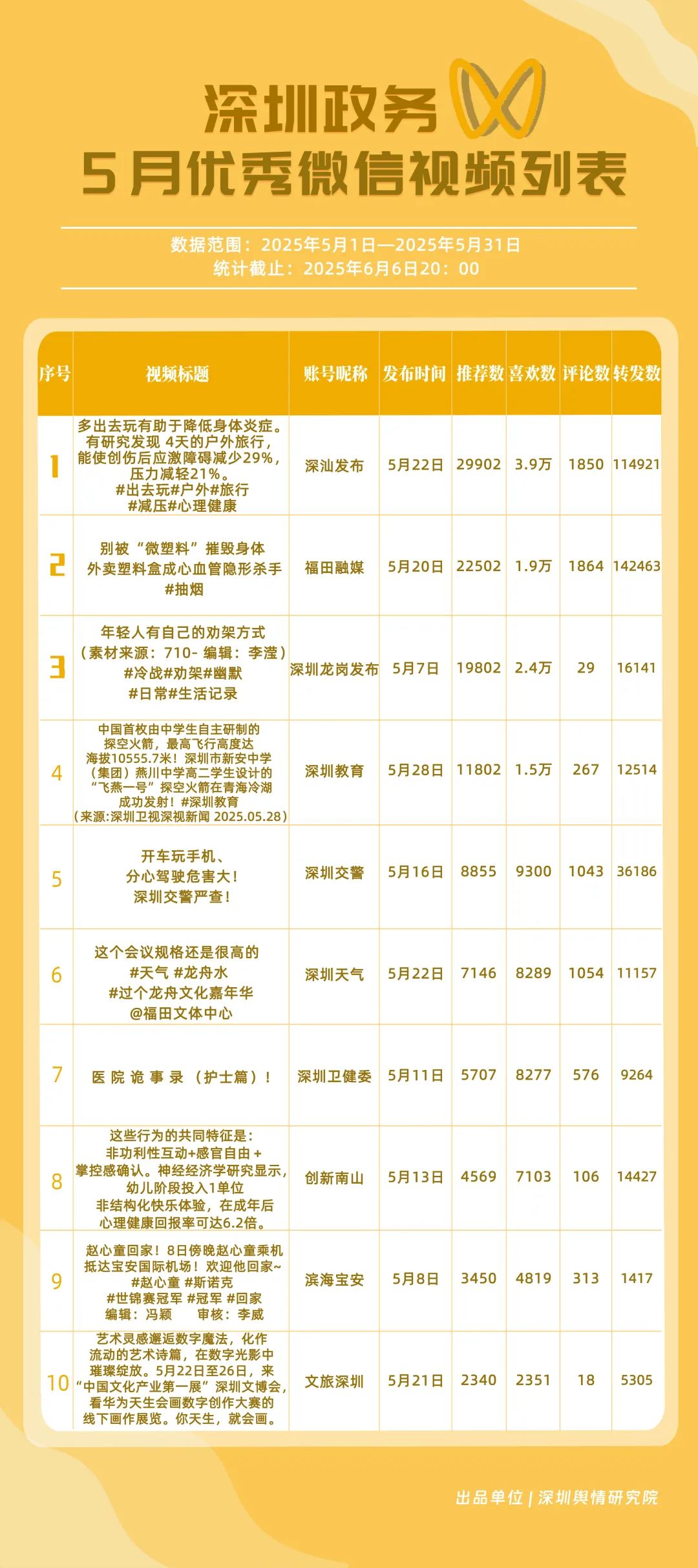 2025年5月期《深圳優(yōu)秀政務(wù)新媒體矩陣》發(fā)布,讓我們共同關(guān)注哪些矩陣以精準(zhǔn)傳播、智慧服務(wù)與創(chuàng)新實(shí)踐,在政務(wù)新媒體領(lǐng)域打造出具有示范價(jià)值的標(biāo)桿案例,以矩陣合力構(gòu)建政務(wù)傳播新生態(tài),為深圳城市網(wǎng)絡(luò)形象塑造持續(xù)注入新動(dòng)能。