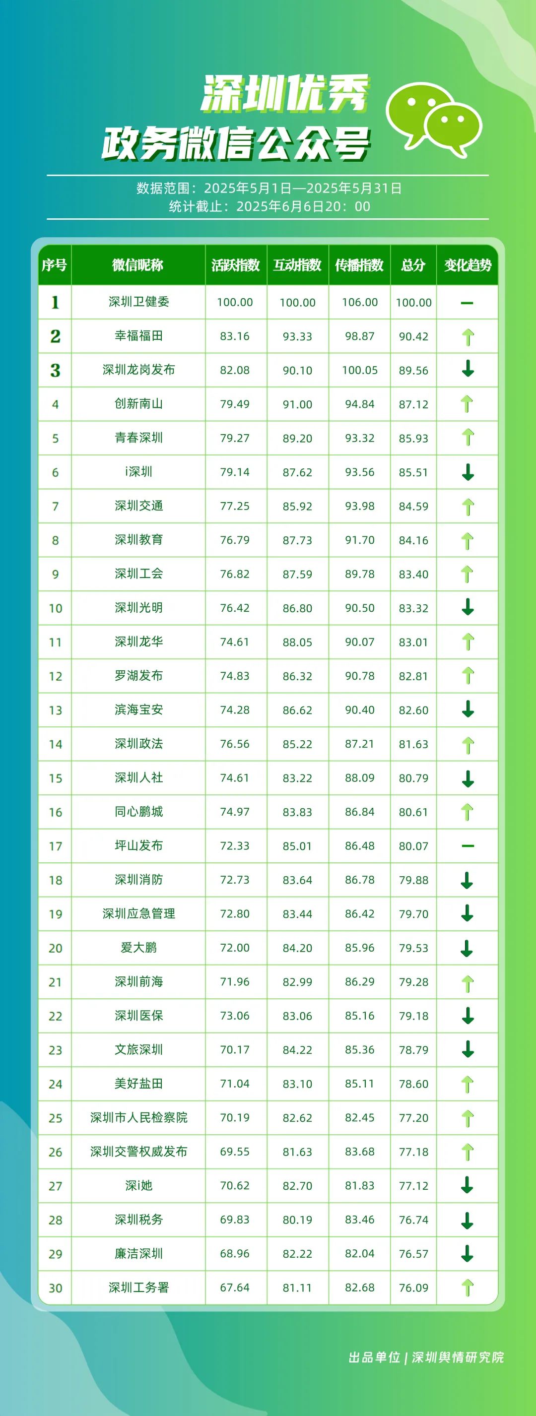 5月,30個(gè)政務(wù)微信公眾號(hào)入選“深圳優(yōu)秀政務(wù)微信公眾號(hào)”榜單,其中包括“深圳衛(wèi)健委”“幸福福田”“深圳龍崗發(fā)布”“創(chuàng)新南山”“青春深圳”“i深圳”“深圳交通”“深圳教育”“深圳工會(huì)”“深圳光明”等。其中,“深圳衛(wèi)健委”在活躍、互動(dòng)、傳播3項(xiàng)指標(biāo)上獲得滿分,其亮眼數(shù)據(jù)彰顯了內(nèi)容創(chuàng)作的高質(zhì)量,位居榜單首位。“幸福福田”同樣表現(xiàn)出色,排名較上個(gè)月有所上升,以總分90.42的優(yōu)異成績(jī)位居榜單第2名;“深圳龍崗發(fā)布”“創(chuàng)新南山”“青春深圳”緊隨其后,以新穎的互動(dòng)形式吸引用戶參與,表現(xiàn)值得肯定。上榜賬號(hào)充分發(fā)揮微信公眾平臺(tái)的傳播優(yōu)勢(shì),以豐富多元的內(nèi)容形態(tài)、生動(dòng)鮮活的表達(dá)風(fēng)格,持續(xù)為市民提供優(yōu)質(zhì)的信息服務(wù)。