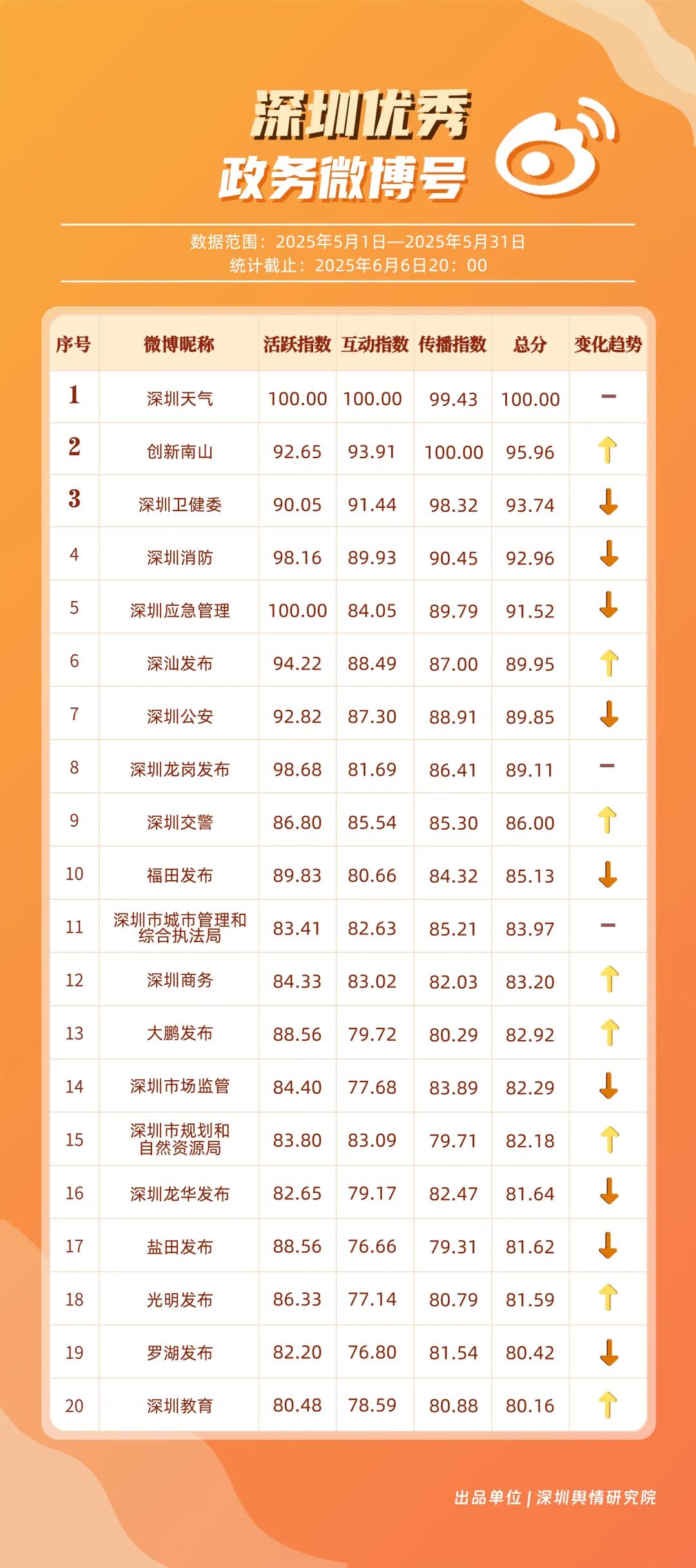 5月,“深圳天氣”“創(chuàng)新南山”“深圳衛(wèi)健委”“深圳消防”“深圳應(yīng)急管理”“深汕發(fā)布”“深圳公安”“深圳龍崗發(fā)布”“深圳交警”“福田發(fā)布”等20個(gè)賬號(hào)入選“優(yōu)秀政務(wù)微博號(hào)”。其中,“深圳天氣”憑借活躍指數(shù)和互動(dòng)指數(shù)雙項(xiàng)滿分的亮眼成績(jī),穩(wěn)居榜單首位?!皠?chuàng)新南山”以95.96分緊隨其后,在互動(dòng)、傳播指數(shù)得分大幅提升,排名實(shí)現(xiàn)顯著躍升?!吧钲谛l(wèi)健委”“深圳消防”“深圳應(yīng)急管理”也表現(xiàn)卓越,總分均超過(guò)90分,它們憑借權(quán)威信息發(fā)布、專業(yè)知識(shí)科普,展現(xiàn)了各單位在民生服務(wù)、公共安全領(lǐng)域的重要作用。以上優(yōu)秀政務(wù)微博號(hào)深度契合平臺(tái)的傳播特征,善于借助熱門話題擴(kuò)大影響力,以鮮明的賬號(hào)特色展現(xiàn)區(qū)域風(fēng)采。