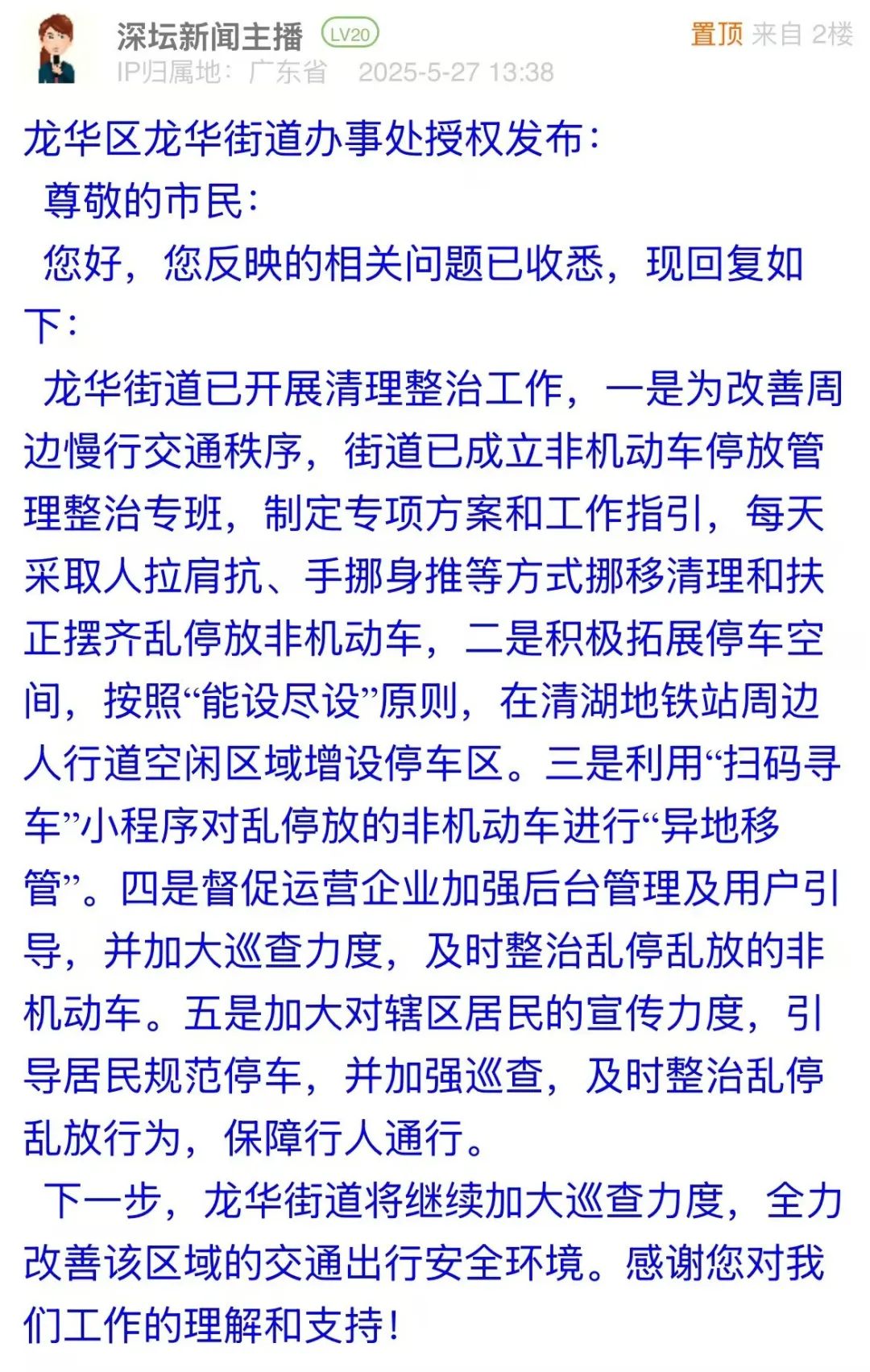 案例點(diǎn)評(píng):地鐵口電動(dòng)車與共享單車堆積,既阻礙行人通行,更影響區(qū)域交通秩序與城市形象。龍華街道辦接訴后迅速響應(yīng),成立專項(xiàng)整治專班,通過(guò)每日清理扶正、增設(shè)停車區(qū)、“掃碼尋車”移管、督促企業(yè)巡查及居民宣傳引導(dǎo)等多維度舉措,破解亂停難題,以“疏堵結(jié)合”的治理智慧,快速行動(dòng),綜合施策,為改善區(qū)域交通環(huán)境提供了務(wù)實(shí)范本。