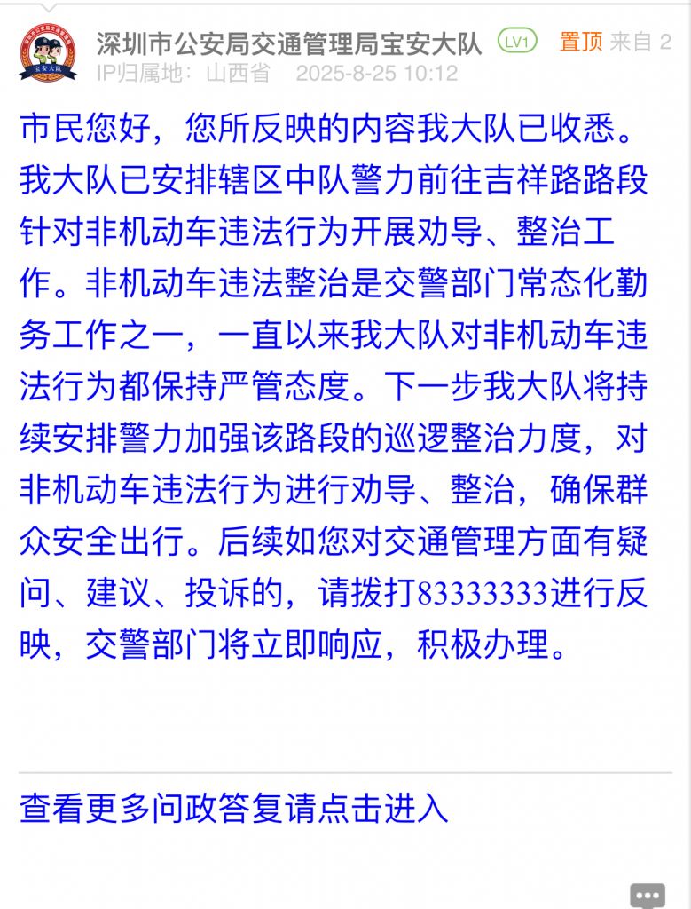 市民您好,您所反映的內(nèi)容我大隊(duì)已收悉。我大隊(duì)已安排轄區(qū)中隊(duì)警力前往吉祥路路段針對(duì)非機(jī)動(dòng)車(chē)違法行為開(kāi)展勸導(dǎo)、整治工作。非機(jī)動(dòng)車(chē)違法整治是交警部門(mén)常態(tài)化勤務(wù)工作之一,一直以來(lái)我大隊(duì)對(duì)非機(jī)動(dòng)車(chē)違法行為都保持嚴(yán)管態(tài)度。下一步我大隊(duì)將持續(xù)安排警力加強(qiáng)該路段的巡邏整治力度,對(duì)非機(jī)動(dòng)車(chē)違法行為進(jìn)行勸導(dǎo)、整治,確保群眾安全出行。后續(xù)如您對(duì)交通管理方面有疑問(wèn)、建議、投訴的,請(qǐng)撥打83333333進(jìn)行反映,交警部門(mén)將立即響應(yīng),積極辦理。