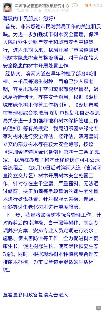 經(jīng)核實(shí),濱河大道在早年種植了部分非洲楝、白千層等速生樹(shù)種,目前已步入衰老期,容易出現(xiàn)樹(shù)干空洞或根部腐爛情況,遇風(fēng)易折斷倒伏,存在安全隱患。根據(jù)《深圳城市綠化樹(shù)木修剪工作指引》、《深圳市城市管理和綜合執(zhí)法局 深圳市規(guī)劃和自然資源局關(guān)于進(jìn)一步加強(qiáng)綠地和樹(shù)木保護(hù)管理工作的通知》等有關(guān)規(guī)定,我局組織園林綠化專(zhuān)家對(duì)樹(shù)木進(jìn)行安全評(píng)估,經(jīng)評(píng)估,濱河皇崗立交的部分樹(shù)木存在較大安全隱患,按照《深圳經(jīng)濟(jì)特區(qū)綠化條例》第四十二條 的規(guī)定, 我局在辦理了樹(shù)木遷移砍伐許可和公示等流程后,在8月10日后對(duì)濱河大道(含濱河皇崗立交片區(qū))樹(shù)木開(kāi)展樹(shù)木安全處置工作,針對(duì)存在主干空腐、嚴(yán)重歪斜,無(wú)法通過(guò)修剪、扶正加固等手段整治的速生老化樹(shù)木進(jìn)行砍伐處置;針對(duì)根冠比失衡、偏冠、歪斜等速生老化樹(shù)木進(jìn)行重度修剪。