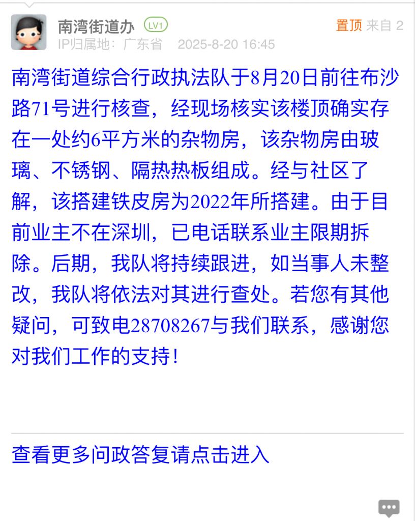 南灣街道綜合行政執(zhí)法隊(duì)于8月20日前往布沙路71號(hào)進(jìn)行核查,經(jīng)現(xiàn)場(chǎng)核實(shí)該樓頂確實(shí)存在一處約6平方米的雜物房,該雜物房由玻璃、不銹鋼、隔熱熱板組成。經(jīng)與社區(qū)了解,該搭建鐵皮房為2022年所搭建。由于目前業(yè)主不在深圳,已電話(huà)聯(lián)系業(yè)主限期拆除。后期,我隊(duì)將持續(xù)跟進(jìn),如當(dāng)事人未整改,我隊(duì)將依法對(duì)其進(jìn)行查處。若您有其他疑問(wèn),可致電28708267與我們聯(lián)系,感謝您對(duì)我們工作的支持!