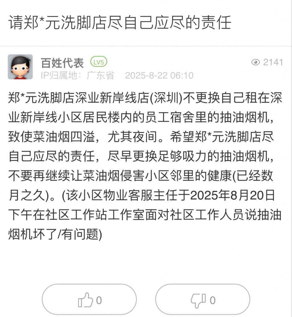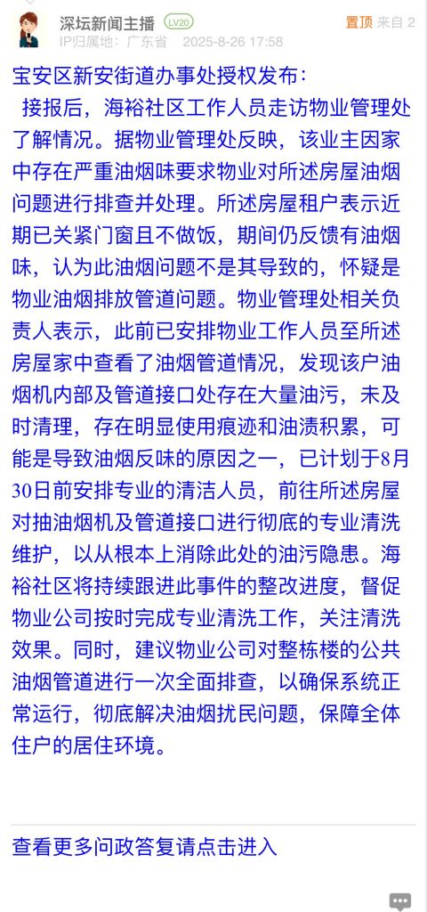 接報(bào)后,海裕社區(qū)工作人員走訪(fǎng)物業(yè)管理處了解情況。據(jù)物業(yè)管理處反映,該業(yè)主因家中存在嚴(yán)重油煙味要求物業(yè)對(duì)所述房屋油煙問(wèn)題進(jìn)行排查并處理。所述房屋租戶(hù)表示近期已關(guān)緊門(mén)窗且不做飯,期間仍反饋有油煙味,認(rèn)為此油煙問(wèn)題不是其導(dǎo)致的,懷疑是物業(yè)油煙排放管道問(wèn)題。物業(yè)管理處相關(guān)負(fù)責(zé)人表示,此前已安排物業(yè)工作人員至所述房屋家中查看了油煙管道情況,發(fā)現(xiàn)該戶(hù)油煙機(jī)內(nèi)部及管道接口處存在大量油污,未及時(shí)清理,存在明顯使用痕跡和油漬積累,可能是導(dǎo)致油煙反味的原因之一,已計(jì)劃于8月30日前安排專(zhuān)業(yè)的清潔人員,前往所述房屋對(duì)抽油煙機(jī)及管道接口進(jìn)行徹底的專(zhuān)業(yè)清洗維護(hù),以從根本上消除此處的油污隱患。海裕社區(qū)將持續(xù)跟進(jìn)此事件的整改進(jìn)度,督促物業(yè)公司按時(shí)完成專(zhuān)業(yè)清洗工作,關(guān)注清洗效果。同時(shí),建議物業(yè)公司對(duì)整棟樓的公共油煙管道進(jìn)行一次全面排查,以確保系統(tǒng)正常運(yùn)行,徹底解決油煙擾民問(wèn)題,保障全體住戶(hù)的居住環(huán)境。