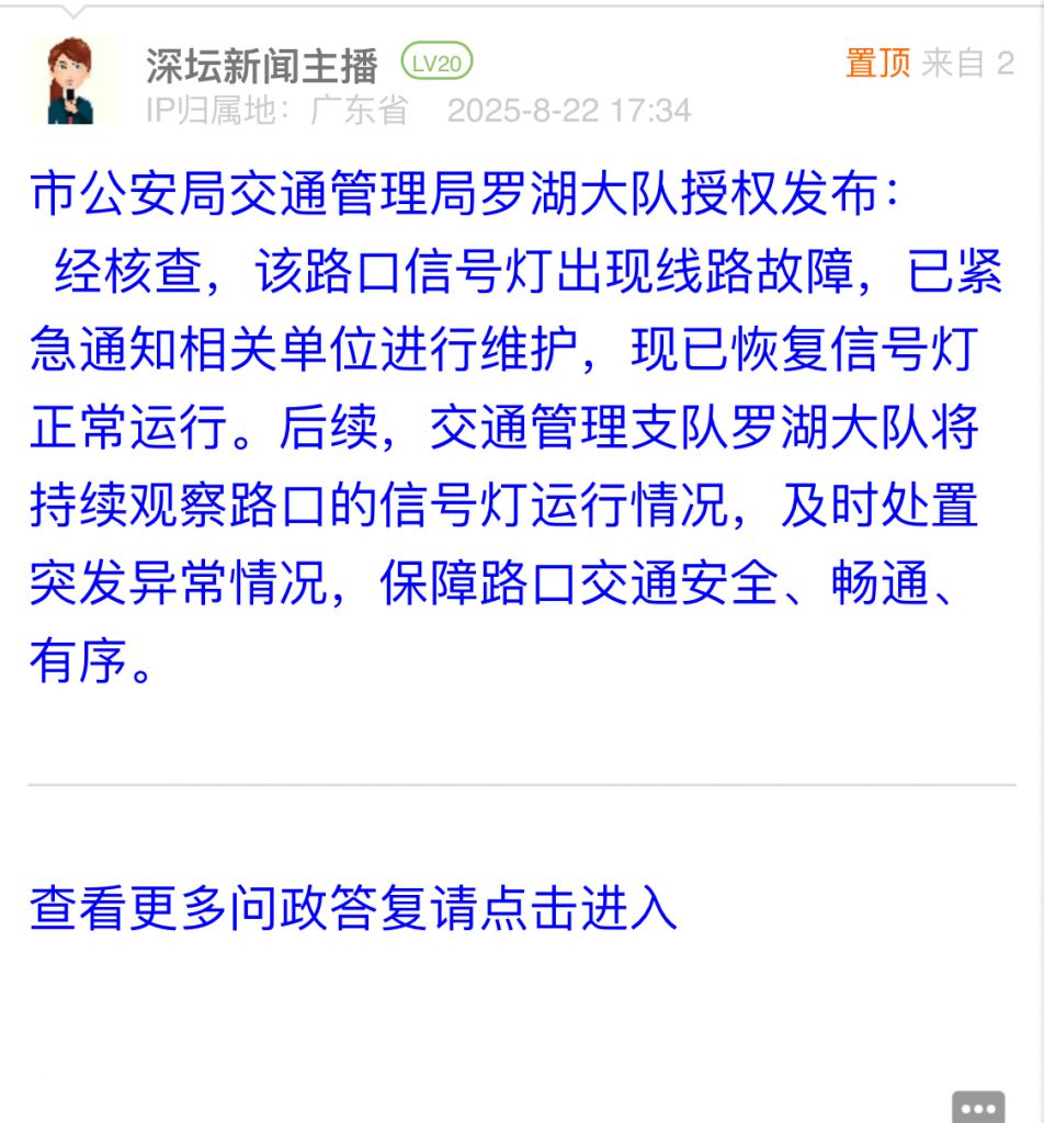 經(jīng)核查,該路口信號(hào)燈出現(xiàn)線(xiàn)路故障,已緊急通知相關(guān)單位進(jìn)行維護(hù),現(xiàn)已恢復(fù)信號(hào)燈正常運(yùn)行。后續(xù),交通管理支隊(duì)羅湖大隊(duì)將持續(xù)觀察路口的信號(hào)燈運(yùn)行情況,及時(shí)處置突發(fā)異常情況,保障路口交通安全、暢通、有序。