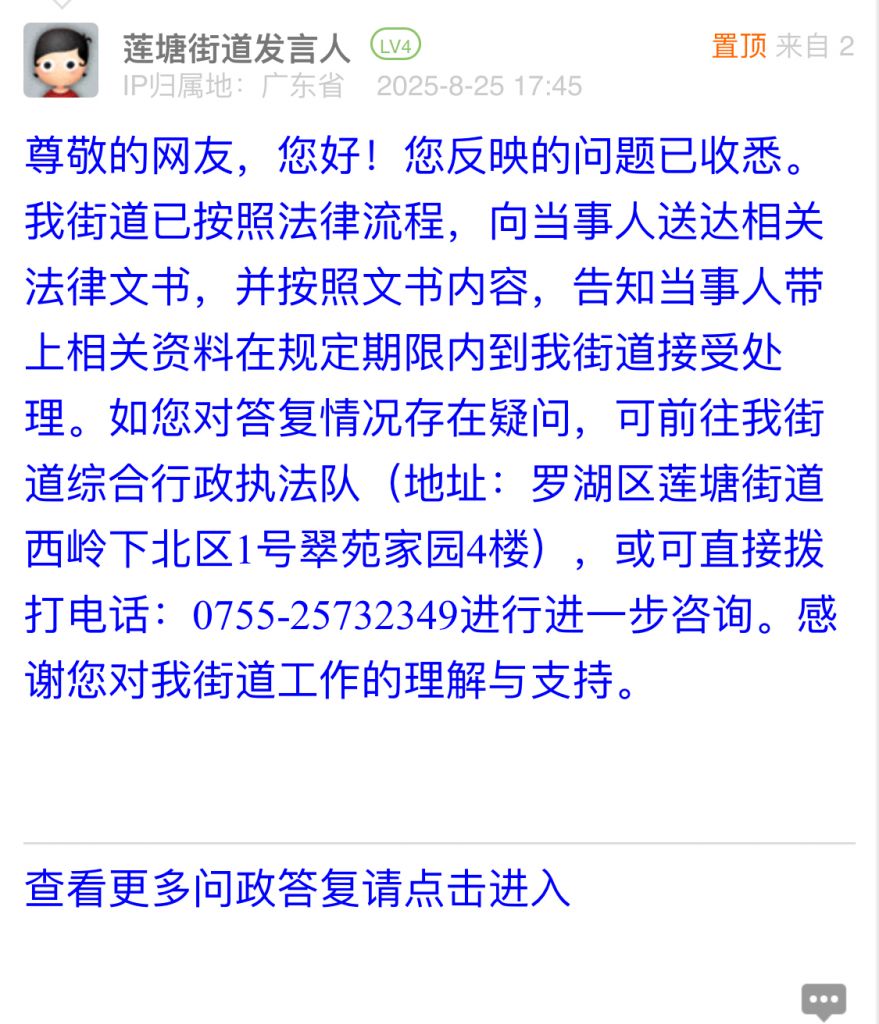 尊敬的網(wǎng)友,您好!您反映的問(wèn)題已收悉。我街道已按照法律流程,向當(dāng)事人送達(dá)相關(guān)法律文書(shū),并按照文書(shū)內(nèi)容,告知當(dāng)事人帶上相關(guān)資料在規(guī)定期限內(nèi)到我街道接受處理。如您對(duì)答復(fù)情況存在疑問(wèn),可前往我街道綜合行政執(zhí)法隊(duì)(地址:羅湖區(qū)蓮塘街道西嶺下北區(qū)1號(hào)翠苑家園4樓),或可直接撥打電話(huà):0755-25732349進(jìn)行進(jìn)一步咨詢(xún)。感謝您對(duì)我街道工作的理解與支持。