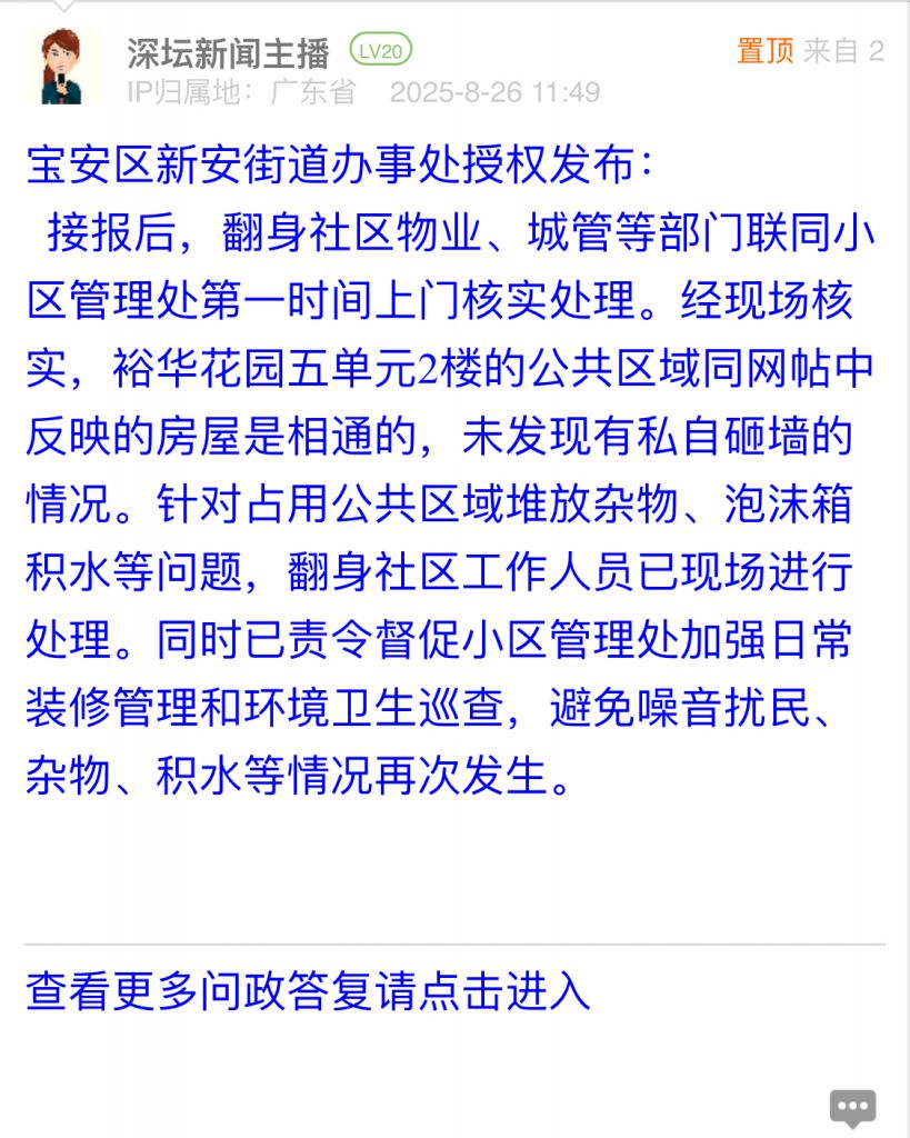 接報(bào)后,翻身社區(qū)物業(yè)、城管等部門(mén)聯(lián)同小區(qū)管理處第一時(shí)間上門(mén)核實(shí)處理。經(jīng)現(xiàn)場(chǎng)核實(shí),裕華花園五單元2樓的公共區(qū)域同網(wǎng)帖中反映的房屋是相通的,未發(fā)現(xiàn)有私自砸墻的情況。針對(duì)占用公共區(qū)域堆放雜物、泡沫箱積水等問(wèn)題,翻身社區(qū)工作人員已現(xiàn)場(chǎng)進(jìn)行處理。同時(shí)已責(zé)令督促小區(qū)管理處加強(qiáng)日常裝修管理和環(huán)境衛(wèi)生巡查,避免噪音擾民、雜物、積水等情況再次發(fā)生。