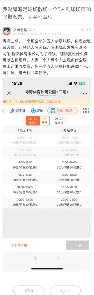 35. 帖文《羅湖粵海足球場(chǎng)散場(chǎng)一個(gè)5人制球場(chǎng)賣(mài)20張散客票,完全不合理》