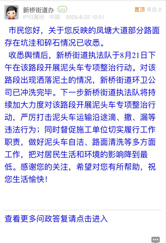 收悉輿情后,新橋街道執(zhí)法隊(duì)于8月21日下午在該路段開(kāi)展泥頭車(chē)專(zhuān)項(xiàng)整治行動(dòng)。對(duì)該路段出現(xiàn)灑落泥土的情況,新橋街道環(huán)衛(wèi)公司已沖洗完畢。下一步新橋街道執(zhí)法隊(duì)將持續(xù)加大力度對(duì)該路段開(kāi)展泥頭車(chē)專(zhuān)項(xiàng)整治行動(dòng),嚴(yán)厲打擊泥頭車(chē)運(yùn)輸沿途滴、撒、漏等違法行為;同時(shí)督促施工單位切實(shí)履行工作職責(zé),做好泥頭車(chē)自潔、路面清洗等多方面工作,把對(duì)居民生活和環(huán)境的影響降到最低。感謝您的關(guān)注,希望對(duì)您有所幫助,祝您生活愉快!