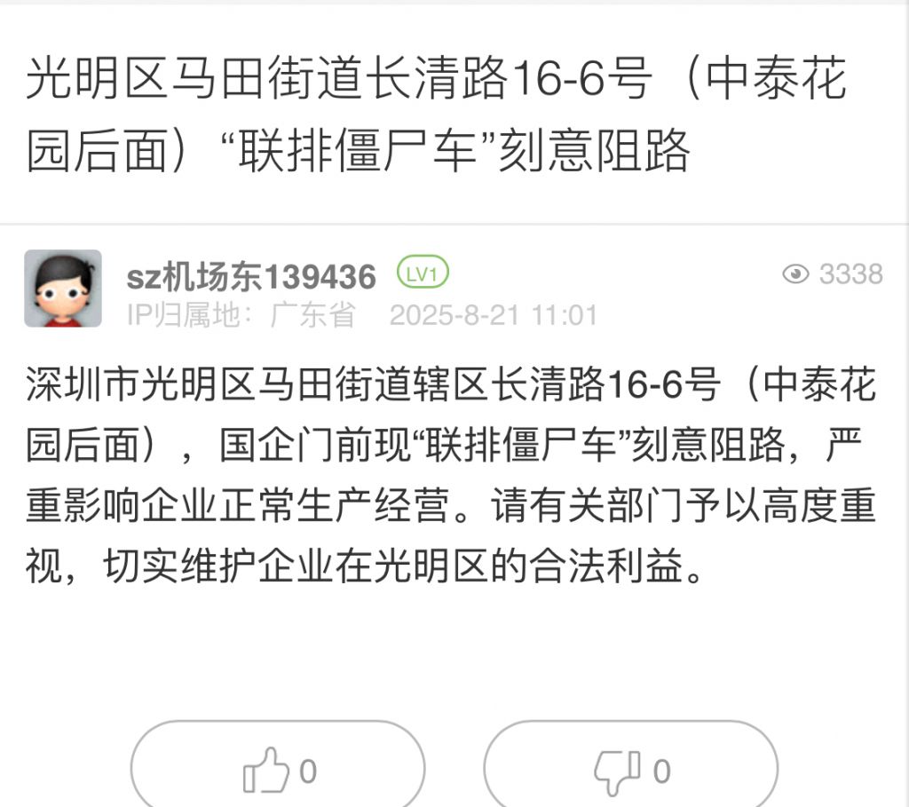 19. 帖文《光明區(qū)馬田街道長(zhǎng)清路16-6號(hào)(中泰花園后面)“聯(lián)排僵尸車(chē)”刻意阻路》