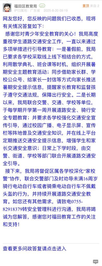 接下來(lái),我局將督促區(qū)屬各學(xué)校深化“家校警”協(xié)作,聯(lián)合交警部門(mén)及時(shí)勸導(dǎo)未滿(mǎn)16周歲騎行電動(dòng)自行車(chē)或者騎乘電動(dòng)自行車(chē)不佩戴頭盔的行為,并持續(xù)開(kāi)展道路交通安全教育。如您還有其他需求,請(qǐng)致電0755-82918379轉(zhuǎn)安全管理科進(jìn)行溝通,我局將竭誠(chéng)為您解答,感謝您對(duì)福田教育工作的關(guān)注和支持!