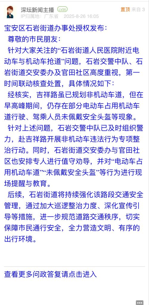 針對(duì)大家關(guān)注的“石巖街道人民醫(yī)院附近電動(dòng)車(chē)與機(jī)動(dòng)車(chē)搶道”問(wèn)題,石巖交警中隊(duì)、石巖街道交安委辦及官田社區(qū)高度重視,第一時(shí)間聯(lián)動(dòng)核查處置,具體情況如下: