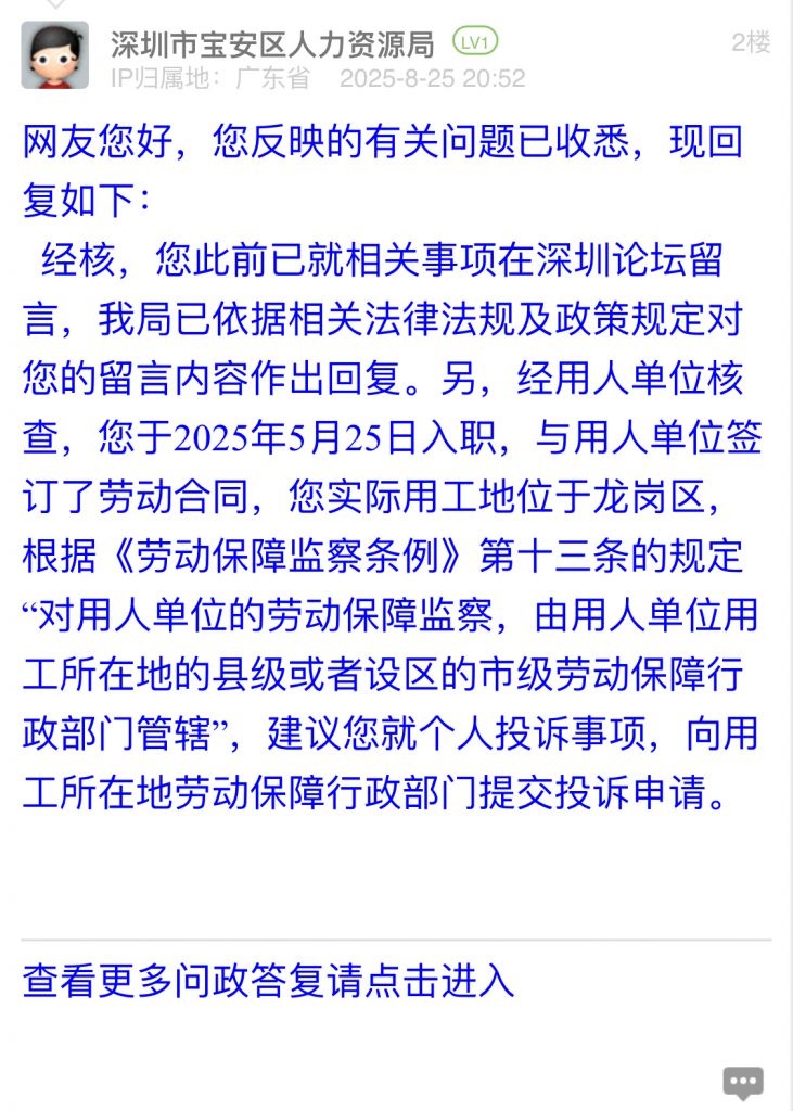 經(jīng)核,您此前已就相關(guān)事項(xiàng)在深圳論壇留言,我局已依據(jù)相關(guān)法律法規(guī)及政策規(guī)定對(duì)您的留言?xún)?nèi)容作出回復(fù)。另,經(jīng)用人單位核查,您于2025年5月25日入職,與用人單位簽訂了勞動(dòng)合同,您實(shí)際用工地位于龍崗區(qū),根據(jù)《勞動(dòng)保障監(jiān)察條例》第十三條的規(guī)定“對(duì)用人單位的勞動(dòng)保障監(jiān)察,由用人單位用工所在地的縣級(jí)或者設(shè)區(qū)的市級(jí)勞動(dòng)保障行政部門(mén)管轄”,建議您就個(gè)人投訴事項(xiàng),向用工所在地勞動(dòng)保障行政部門(mén)提交投訴申請(qǐng)。
