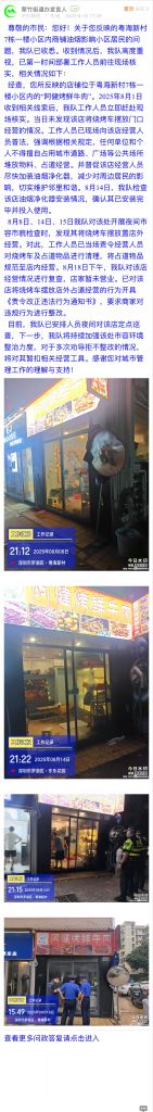 經(jīng)查,您所反映的店鋪位于粵海新村7棟一樓小區(qū)內(nèi)的“阿健烤鮮牛肉”。2025年8月1日收到相關(guān)線(xiàn)索后,我隊(duì)工作人員立即趕赴現(xiàn)場(chǎng)核實(shí)。當(dāng)日未發(fā)現(xiàn)該店將燒烤車(chē)擺放門(mén)口經(jīng)營(yíng)的情況。工作人員已現(xiàn)場(chǎng)向該店經(jīng)營(yíng)人員普法,強(qiáng)調(diào)根據(jù)相關(guān)規(guī)定,任何單位和個(gè)人不得擅自占用城市道路、廣場(chǎng)等公共場(chǎng)所堆放物料、占道經(jīng)營(yíng)。并督促該店經(jīng)營(yíng)人員盡快加裝油煙凈化器,減少對(duì)周邊居民的影響,切實(shí)維護(hù)鄰里和諧。8月14日,我隊(duì)檢查該店油煙凈化器安裝情況,確認(rèn)其已安裝完畢并投入使用。