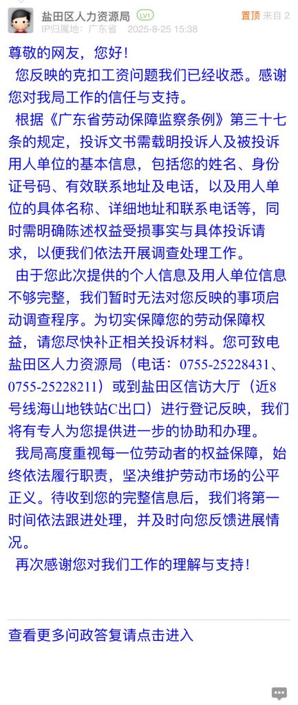 由于您此次提供的個(gè)人信息及用人單位信息不夠完整,我們暫時(shí)無(wú)法對(duì)您反映的事項(xiàng)啟動(dòng)調(diào)查程序。為切實(shí)保障您的勞動(dòng)保障權(quán)益,請(qǐng)您盡快補(bǔ)正相關(guān)投訴材料。您可致電鹽田區(qū)人力資源局(電話(huà):0755-25228431、0755-25228211)或到鹽田區(qū)信訪(fǎng)大廳(近8號(hào)線(xiàn)海山地鐵站C出口)進(jìn)行登記反映,我們將有專(zhuān)人為您提供進(jìn)一步的協(xié)助和辦理。