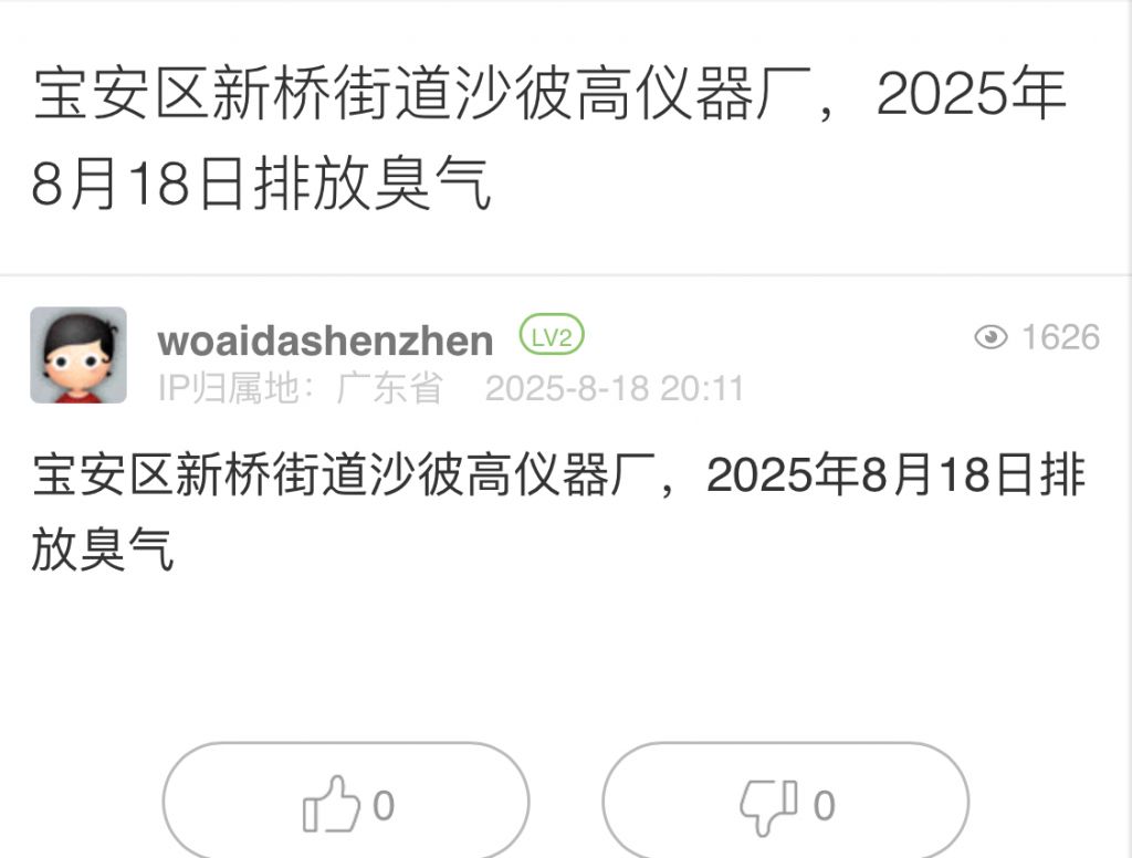 4. 帖文《寶安區(qū)新橋街道沙彼高儀器廠(chǎng),2025年8月18日排放臭氣》