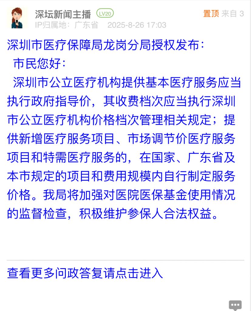 深圳市公立醫(yī)療機(jī)構(gòu)提供基本醫(yī)療服務(wù)應(yīng)當(dāng)執(zhí)行政府指導(dǎo)價(jià),其收費(fèi)檔次應(yīng)當(dāng)執(zhí)行深圳市公立醫(yī)療機(jī)構(gòu)價(jià)格檔次管理相關(guān)規(guī)定;提供新增醫(yī)療服務(wù)項(xiàng)目、市場(chǎng)調(diào)節(jié)價(jià)醫(yī)療服務(wù)項(xiàng)目和特需醫(yī)療服務(wù)的,在國(guó)家、廣東省及本市規(guī)定的項(xiàng)目和費(fèi)用規(guī)模內(nèi)自行制定服務(wù)價(jià)格。我局將加強(qiáng)對(duì)醫(yī)院醫(yī)保基金使用情況的監(jiān)督檢查,積極維護(hù)參保人合法權(quán)益。