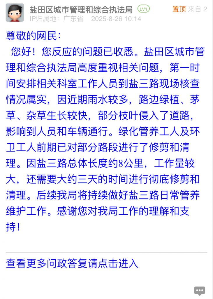 您好!您反應(yīng)的問(wèn)題已收悉。鹽田區(qū)城市管理和綜合執(zhí)法局高度重視相關(guān)問(wèn)題,第一時(shí)間安排相關(guān)科室工作人員到鹽三路現(xiàn)場(chǎng)核查情況屬實(shí),因近期雨水較多,路邊綠植、茅草、雜草生長(zhǎng)較快,部分枝葉侵入了道路,影響到人員和車(chē)輛通行。綠化管養(yǎng)工人及環(huán)衛(wèi)工人前期已對(duì)部分路段進(jìn)行了修剪和清理。因鹽三路總體長(zhǎng)度約8公里,工作量較大,還需要大約三天的時(shí)間進(jìn)行徹底修剪和清理。后續(xù)我局將持續(xù)做好鹽三路日常管養(yǎng)維護(hù)工作。感謝您對(duì)我局工作的理解和支持!