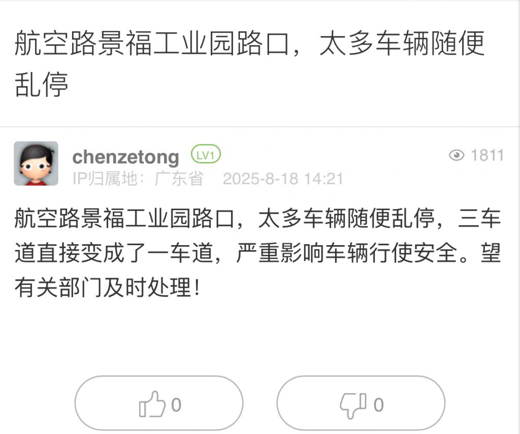 2. 帖文《航空路景福工業(yè)園路口,太多車(chē)輛隨便亂停》