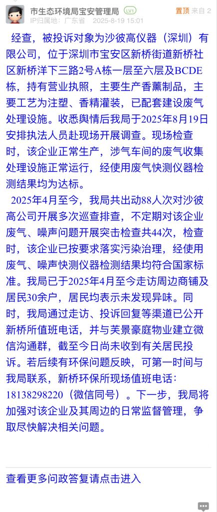 經(jīng)查,被投訴對(duì)象為沙彼高儀器(深圳)有限公司,位于深圳市寶安區(qū)新橋街道新橋社區(qū)新橋洋下三路2號(hào)A棟一層至六層及BCDE棟,持有營(yíng)業(yè)執(zhí)照,主要生產(chǎn)香薰制品,主要工藝為注塑、香精灌裝,已配套建設(shè)廢氣處理設(shè)施。收悉輿情后我局于2025年8月19日安排執(zhí)法人員赴現(xiàn)場(chǎng)開(kāi)展調(diào)查?,F(xiàn)場(chǎng)檢查時(shí),該企業(yè)正常生產(chǎn),涉氣車(chē)間的廢氣收集處理設(shè)施正常運(yùn)行,經(jīng)使用廢氣快測(cè)儀器檢測(cè)結(jié)果均為達(dá)標(biāo)。