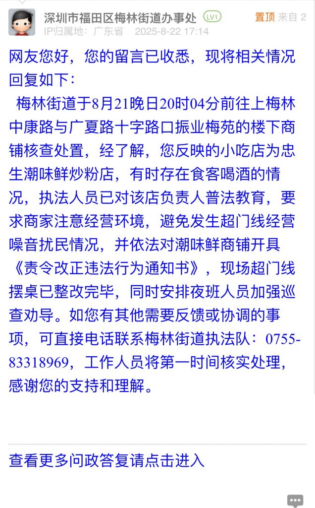 梅林街道于8月21晚日20時(shí)04分前往上梅林中康路與廣夏路十字路口振業(yè)梅苑的樓下商鋪核查處置,經(jīng)了解,您反映的小吃店為忠生潮味鮮炒粉店,有時(shí)存在食客喝酒的情況,執(zhí)法人員已對(duì)該店負(fù)責(zé)人普法教育,要求商家注意經(jīng)營(yíng)環(huán)境,避免發(fā)生超門(mén)線(xiàn)經(jīng)營(yíng)噪音擾民情況,并依法對(duì)潮味鮮商鋪開(kāi)具《責(zé)令改正違法行為通知書(shū)》,現(xiàn)場(chǎng)超門(mén)線(xiàn)擺桌已整改完畢,同時(shí)安排夜班人員加強(qiáng)巡查勸導(dǎo)。如您有其他需要反饋或協(xié)調(diào)的事項(xiàng),可直接電話(huà)聯(lián)系梅林街道執(zhí)法隊(duì):0755-83318969,工作人員將第一時(shí)間核實(shí)處理,感謝您的支持和理解。