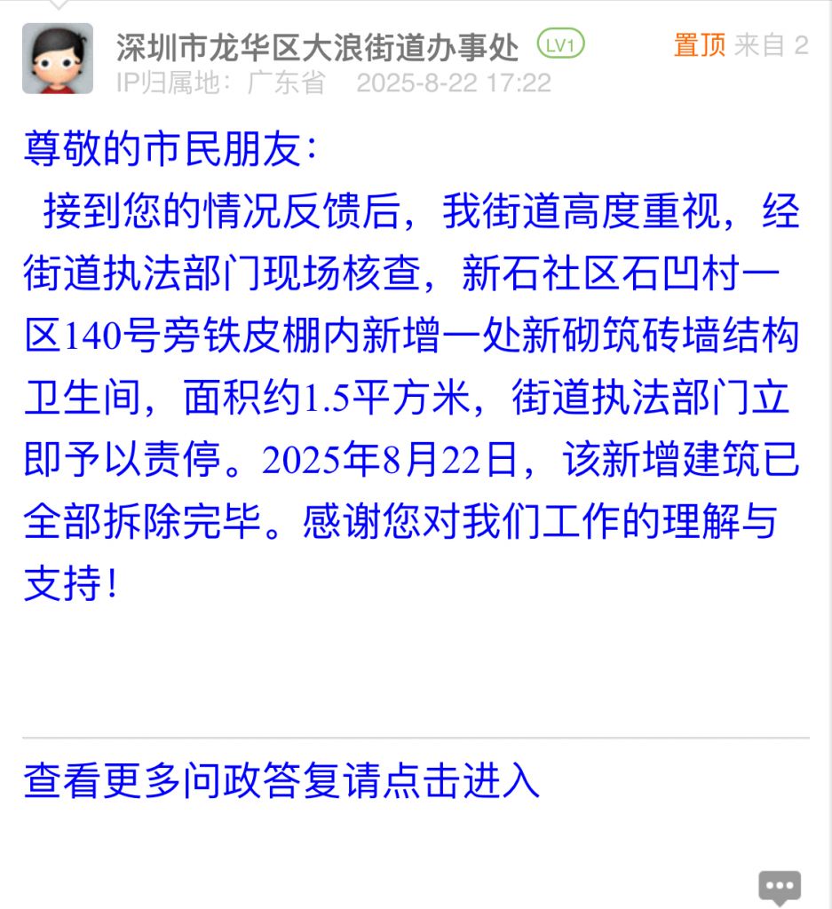 接到您的情況反饋后,我街道高度重視,經(jīng)街道執(zhí)法部門(mén)現(xiàn)場(chǎng)核查,新石社區(qū)石凹村一區(qū)140號(hào)旁鐵皮棚內(nèi)新增一處新砌筑磚墻結(jié)構(gòu)衛(wèi)生間,面積約1.5平方米,街道執(zhí)法部門(mén)立即予以責(zé)停。2025年8月22日,該新增建筑已全部拆除完畢。感謝您對(duì)我們工作的理解與支持!