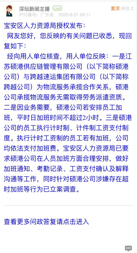 經(jīng)向用人單位核查,用人單位反映:一是江蘇碩港供應(yīng)鏈管理有限公司(以下簡(jiǎn)稱(chēng)碩港公司)與跨越速運(yùn)集團(tuán)有限公司(以下簡(jiǎn)稱(chēng)跨越公司)為物流服務(wù)承攬合作關(guān)系,碩港公司承攬物流服務(wù)無(wú)需取得勞務(wù)派遣資質(zhì)。二是因業(yè)務(wù)需要,碩港公司若安排員工加班,平時(shí)日加班時(shí)間不超過(guò)2小時(shí)。三是碩港公司的員工執(zhí)行計(jì)時(shí)制、計(jì)件制工資支付制度。執(zhí)行計(jì)時(shí)工資制的員工若有加班,公司均依法支付加班費(fèi)。寶安區(qū)人力資源局已要求碩港公司在人員加班方面合理安排,做好加班通知、考勤記錄、工資支付確認(rèn)及解釋溝通等工作,同時(shí)針對(duì)碩港公司涉嫌存在超時(shí)加班等行為已立案調(diào)查。