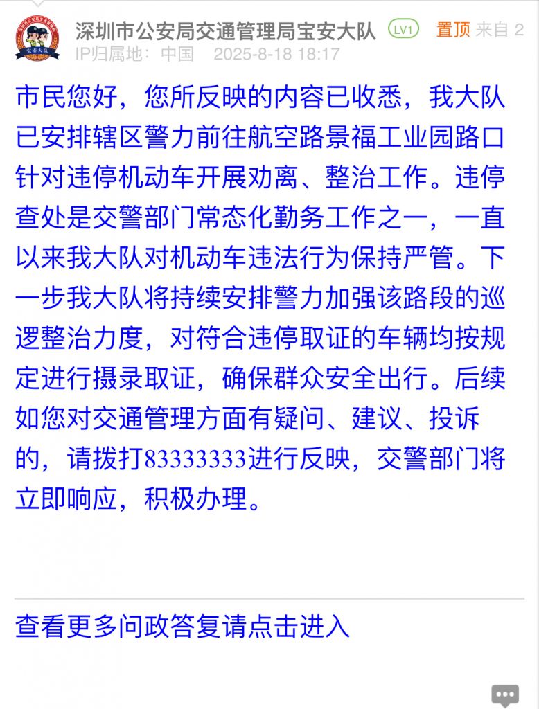 市民您好,您所反映的內(nèi)容已收悉,我大隊(duì)已安排轄區(qū)警力前往航空路景福工業(yè)園路口針對(duì)違停機(jī)動(dòng)車(chē)開(kāi)展勸離、整治工作。違停查處是交警部門(mén)常態(tài)化勤務(wù)工作之一,一直以來(lái)我大隊(duì)對(duì)機(jī)動(dòng)車(chē)違法行為保持嚴(yán)管。下一步我大隊(duì)將持續(xù)安排警力加強(qiáng)該路段的巡邏整治力度,對(duì)符合違停取證的車(chē)輛均按規(guī)定進(jìn)行攝錄取證,確保群眾安全出行。后續(xù)如您對(duì)交通管理方面有疑問(wèn)、建議、投訴的,請(qǐng)撥打83333333進(jìn)行反映,交警部門(mén)將立即響應(yīng),積極辦理。