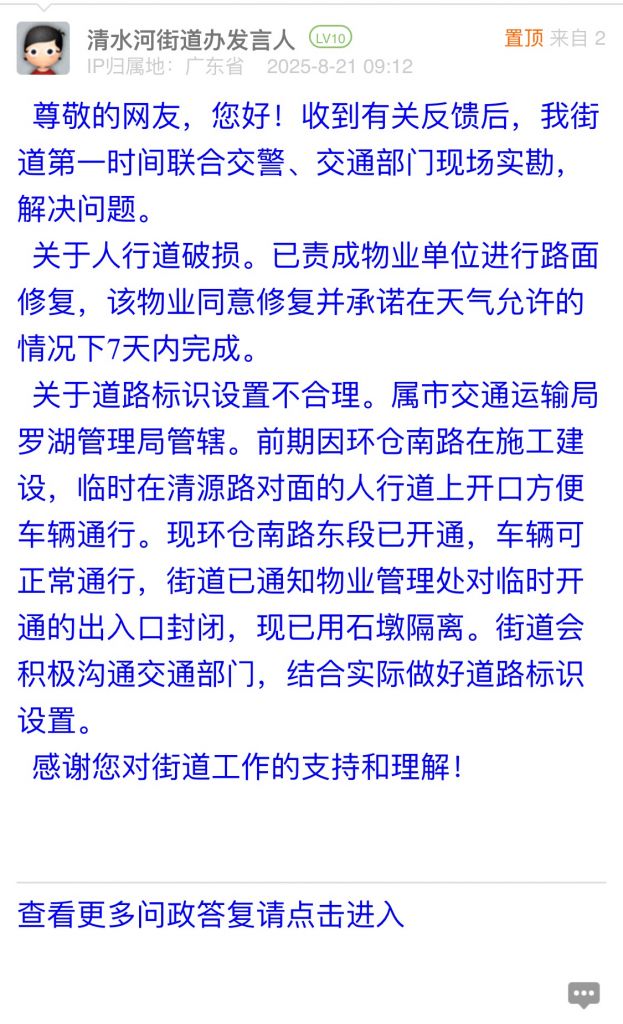 關(guān)于道路標(biāo)識(shí)設(shè)置不合理。屬市交通運(yùn)輸局羅湖管理局管轄。前期因環(huán)倉(cāng)南路在施工建設(shè),臨時(shí)在清源路對(duì)面的人行道上開(kāi)口方便車(chē)輛通行?,F(xiàn)環(huán)倉(cāng)南路東段已開(kāi)通,車(chē)輛可正常通行,街道已通知物業(yè)管理處對(duì)臨時(shí)開(kāi)通的出入口封閉,現(xiàn)已用石墩隔離。街道會(huì)積極溝通交通部門(mén),結(jié)合實(shí)際做好道路標(biāo)識(shí)設(shè)置。