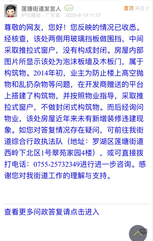 尊敬的網(wǎng)友,您好!您反映的情況已收悉。經(jīng)核查,該處兩側(cè)用玻璃擋板做圍擋,中間采取推拉式窗戶(hù),沒(méi)有構(gòu)成封閉。房屋內(nèi)部圖片所顯示該處為泡沫板墻及木板門(mén),屬于構(gòu)筑物。2014年初,業(yè)主為防止樓上高空拋物和亂扔雜物等問(wèn)題,在開(kāi)發(fā)商贈(zèng)送的平臺(tái)上搭建了構(gòu)筑物,并按照物業(yè)指導(dǎo),采取推拉式窗戶(hù),不做封閉式構(gòu)筑物。而后經(jīng)詢(xún)問(wèn)物業(yè),該處房屋近年來(lái)未有新增裝修違建現(xiàn)象。如您對(duì)答復(fù)情況存在疑問(wèn),可前往我街道綜合行政執(zhí)法隊(duì)(地址:羅湖區(qū)蓮塘街道西嶺下北區(qū)1號(hào)翠苑家園4樓),或可直接撥打電話(huà):0755-25732349進(jìn)行進(jìn)一步咨詢(xún)。感謝您對(duì)我街道工作的理解與支持。